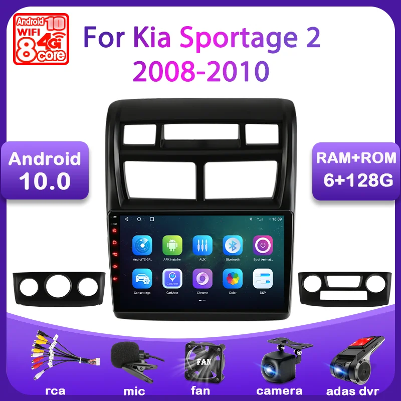 Автомагнитола на Android 10 для Kia Sportage 2 2008 2009 2010, мультимедийный видеоплеер с GPS-навигацией, 2 Din, 4G, Wi-Fi, carplay, стерео, DVD