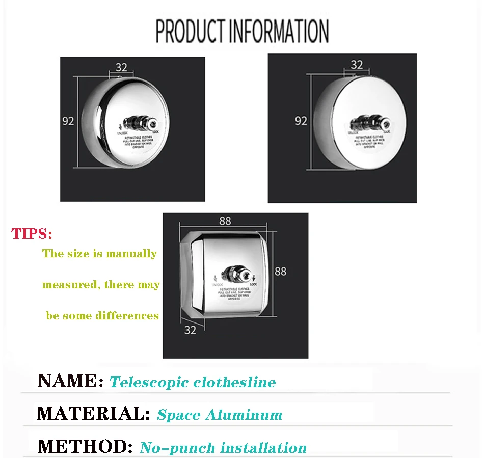 Название: невидимая телескопическая бельевая веревка для балкона Материал: космический алюминий + нейлоновый трос Цвет: круглый, квадратный, круглый Размер: 2,8 метров Функция: высокая эластичность, свободное расширение и сжатие, большая грузоподъемность, удобство переноски, защита от запутывания, ветра и скольжения, удобство хранения, съемная веревка, удобство и практичность, подходит для многофункционального использования Применимые варианты: путешествия и отпуск, кемпинг на природе, отель для деловых поездок и т. д.: