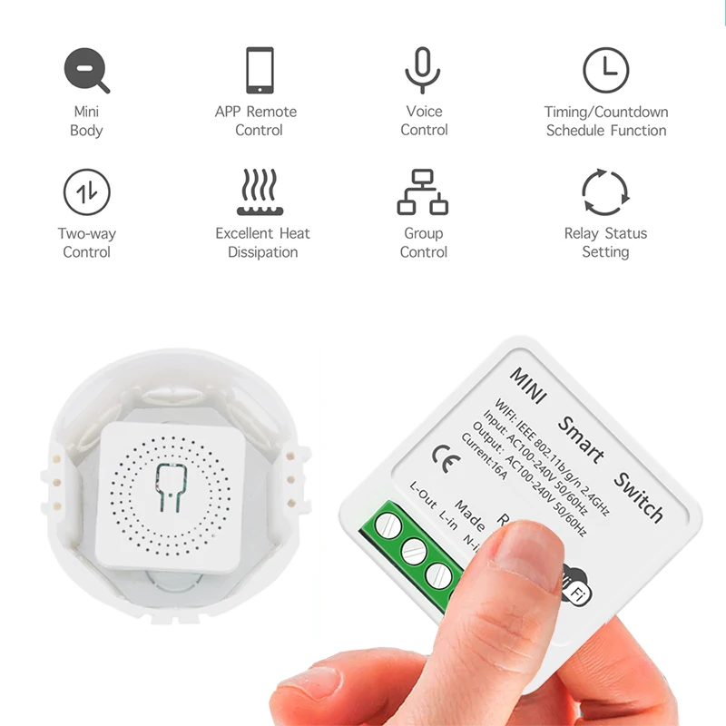 Основные характеристики: 1. Специальный мини-корпус умный, компактный, легко разместить, 40*40*21 мм, работает с большинством ящиков, выключателей и настенных розеток.