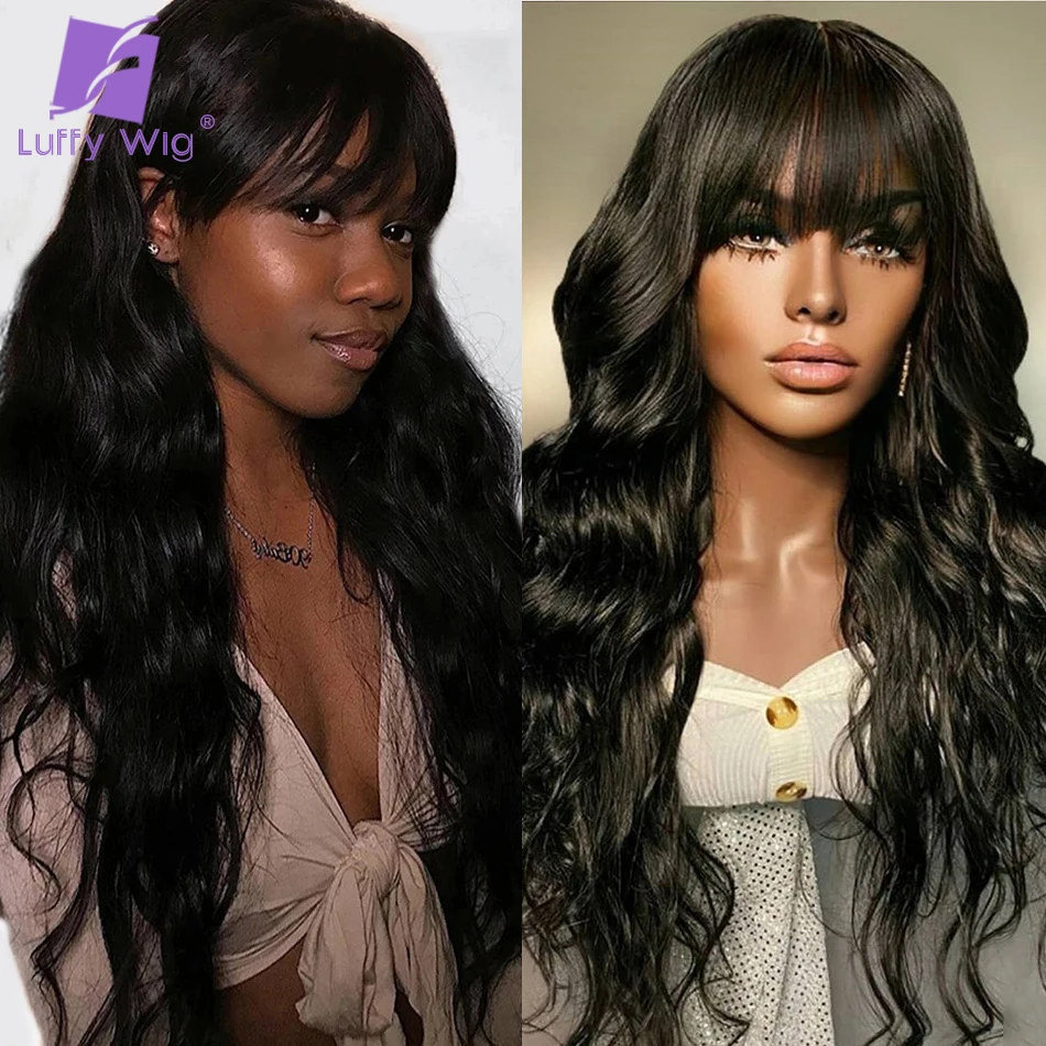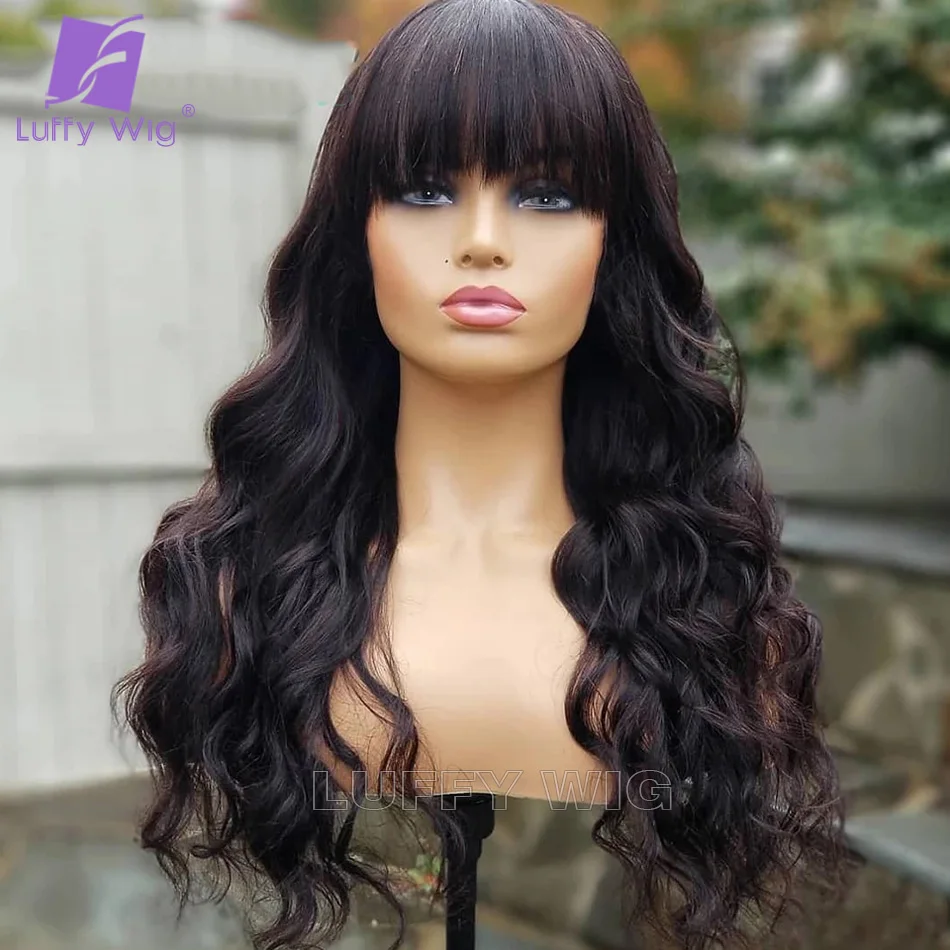 Парик свободной волны с челкой, парик полностью машинной работы, парик, Длинные бразильские волнистые человеческие волосы, парики для чернокожих женщин Luffywig