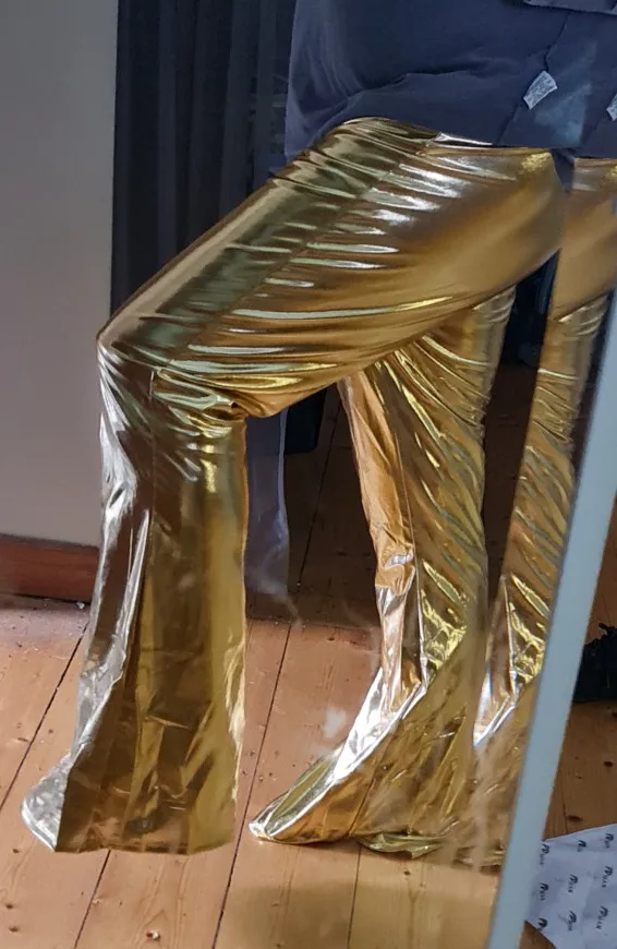Для взрослых мужские мото Клубная одежда стиля панк вечерние Брюки Блестящий металлический брюки в стиле диско с расклешенных расклешенные длинные штаны Dude костюм с брюками
