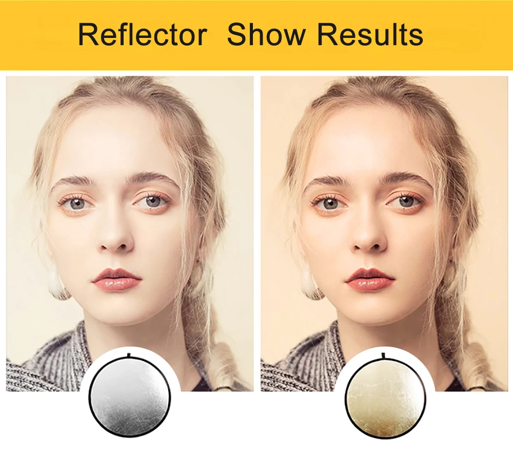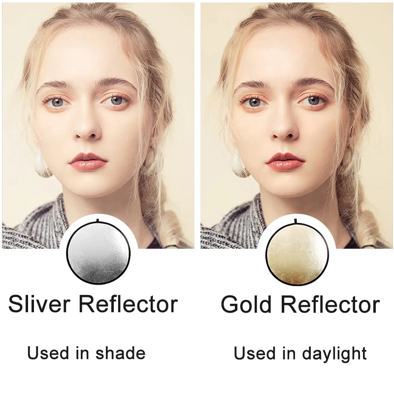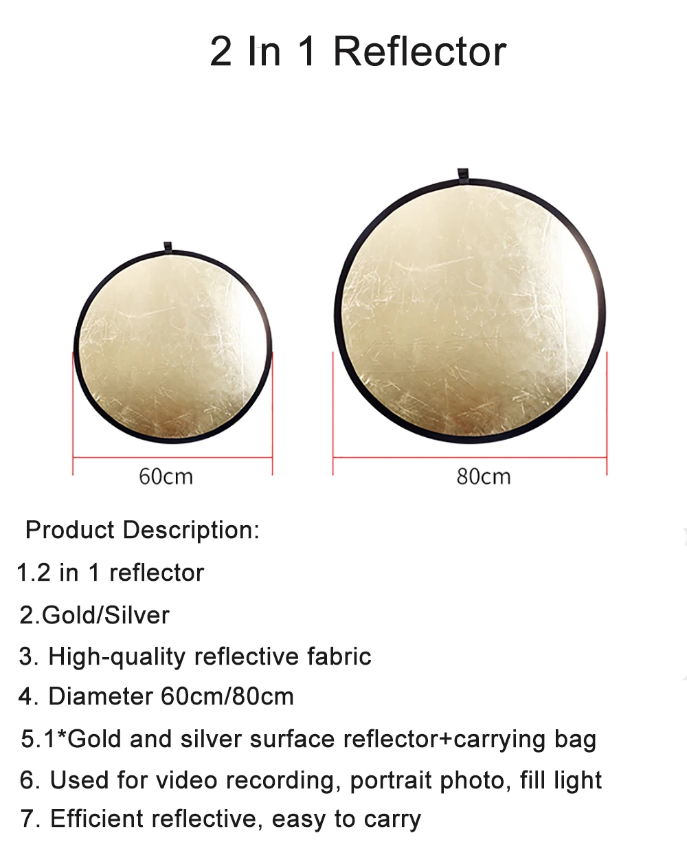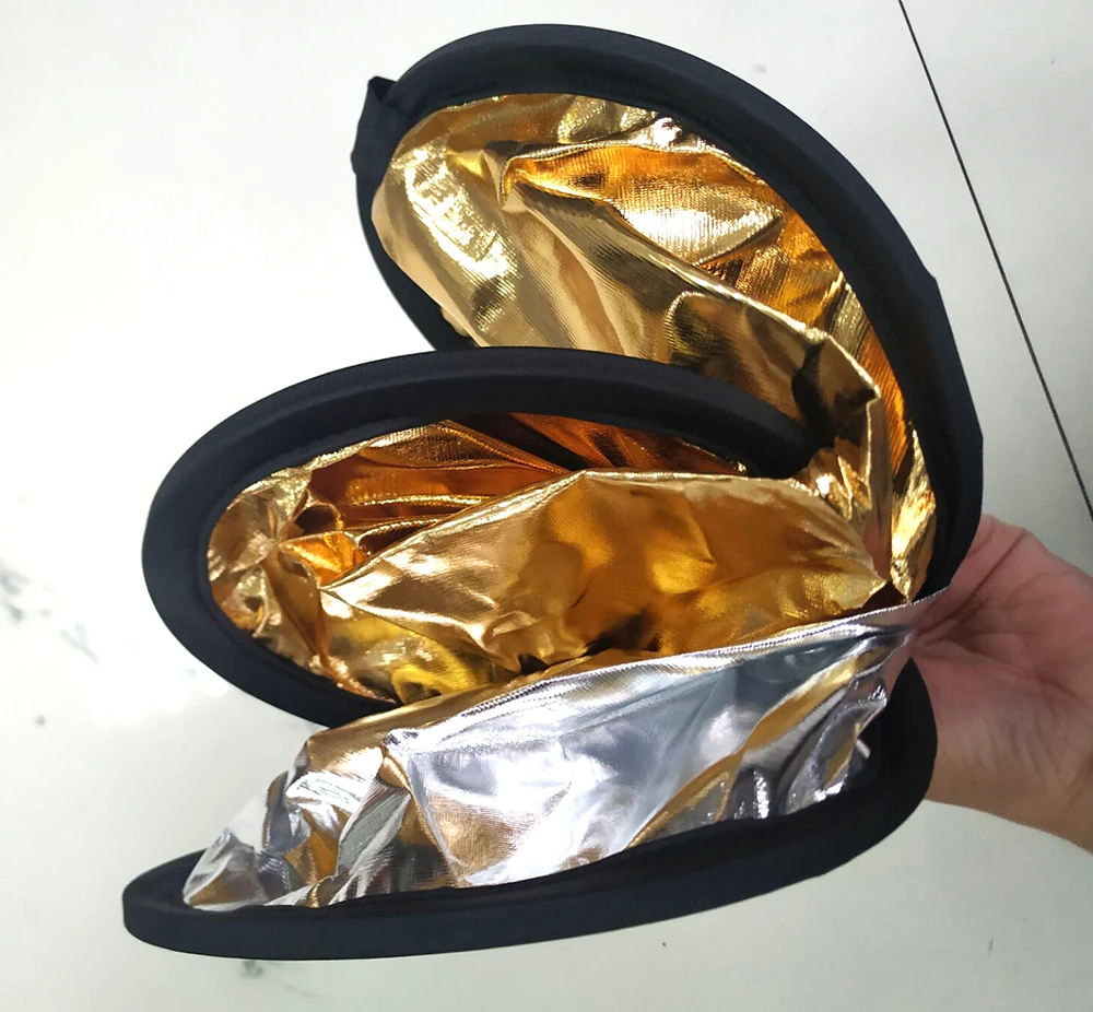 Цвет: золотой, серебряныйРазмер (диаметр):60 см/24 дюйма, 80 см/32 дюймаФорма: круглаяПосылка Размеры: 25x25x5cmПосылка, вес: 60 см 0,18 кг 80 см 0,28 кгЭффекты различных отражателей:А-серебро: ярче картинкиB- Gold: теплые огниОсобенности продукта:2 в 1: золото, сереброОтражатель с пятью различными отражающими поверхностями может использоваться для заполнения, отражения, диффузного, поглощающего или смягчающего светильник.Прочный и гибкий стальной каркас, его можно легко сложить в небольшой размер.В комплект входит двойной чехол на молнии для переноски.Примечание:Качество опорного стального стержня для отражателя лучше, а эластичность также большая. Пожалуйста, обратите внимание на эластичность при разворачивании и не подпрыгивайте к себе или другим.24 "/60 см 32"/80 см 2 в 1 отражатель светильник-диффузор ручной держатель мульти складной портативный для фотостудии золото серебро
