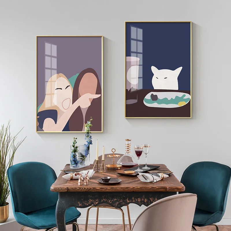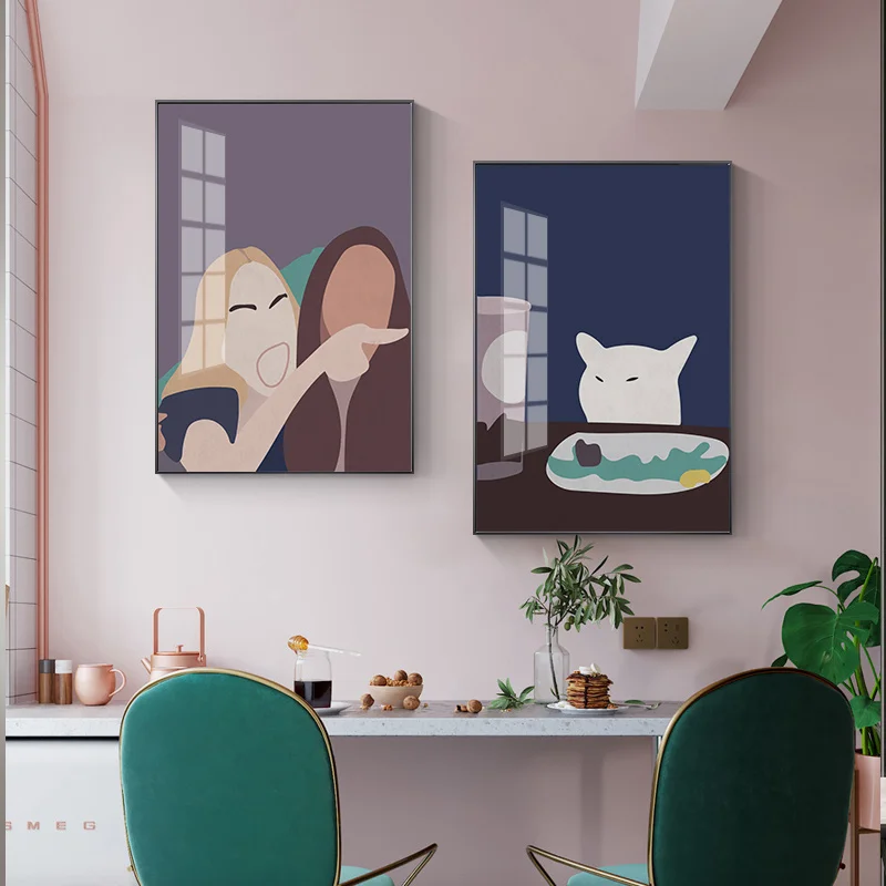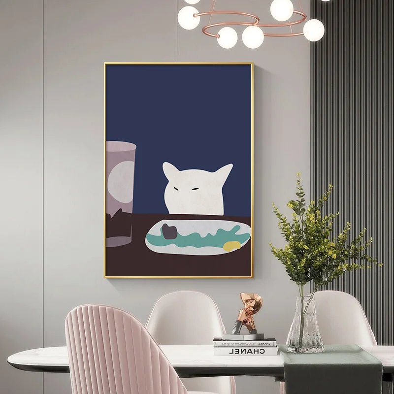 Простая Скандинавская абстрактная фигурка кошка едает рыбу забавное Искусство украшение детской комнаты картина для гостиной Картина на холсте