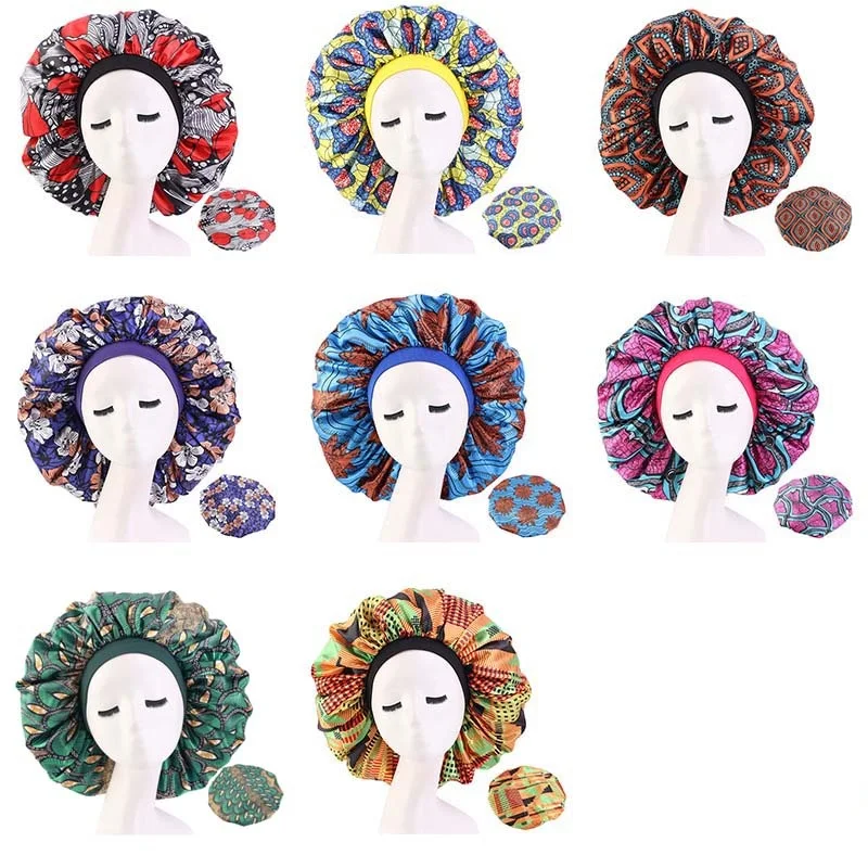 Новая женская сатиновая шапка большого размера с красивым принтом, шелковая шляпа шапка для сна, головной убор, шапка для вьющихся, пружинящих волос, черного цвета