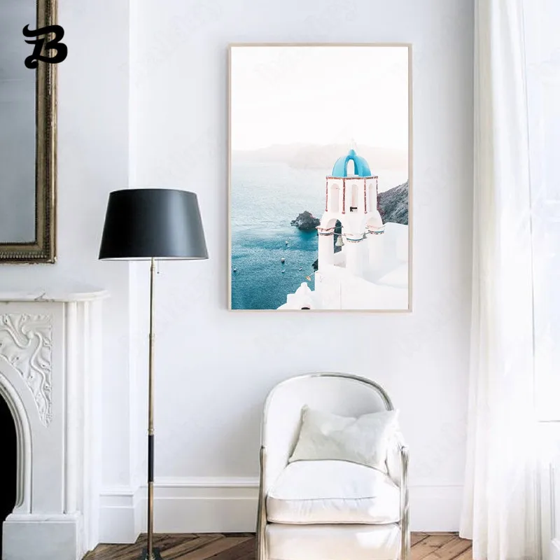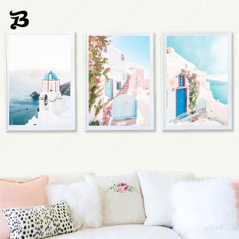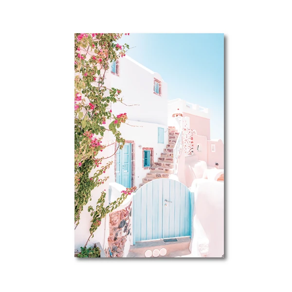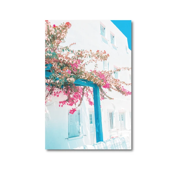Постеры фантазийные для путешествий, остров и цветы, синее море и розовый Санторини, настенная Картина на холсте для гостиной, украшение для дома