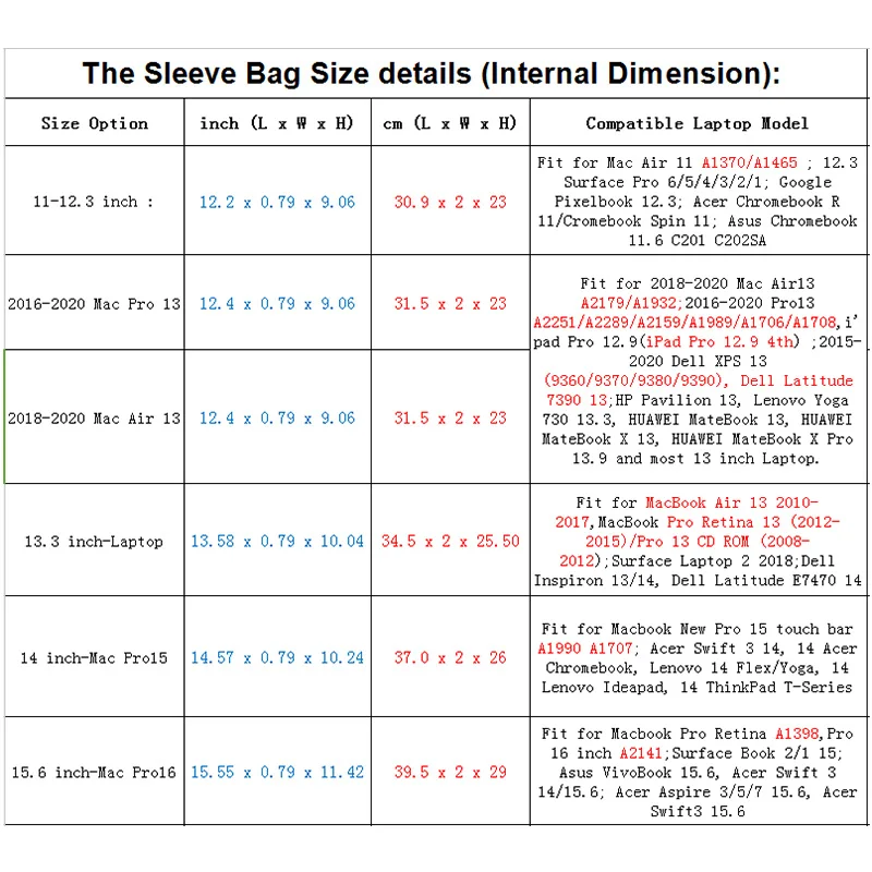 Подходит для планшета ipad 10,5 дюйма или аналогичного размера 11,6 дюйма 12,2x0,79x9,06 дюйма 30,98x2x23 см Подходит для ноутбука Macbook Air 11 дюймов или аналогичного размера 12,0 дюйма 11,61x0,79x8,66 дюйма 29,48x2x22 см Подходит для ноутбука Macbook 12 дюймов или аналогичного размера Новейший Air13Про13 12,4x0,79x9,06 Дюймы 31,5x2x23См Подходит для Macbook новейший Pro13 дюймов и новейший Air 13 дюймов 13,3 дюйма 13,58x0,79x10,04 дюйма 34,5x2x25,5 см Подходит для старого Macbook Air 13 дюймов/Pro Retina 13 дюймов/Pro 13 CD ROM 14,0 дюйма-Pro 15 A1990 A1707 14,57x0,79x10,24 дюйма 37x2x26 см Подходит для Macbook Pro 15 дюймов с сенсорной панелью A1990 A1707 15,6 дюйма-Mac Pro 16 A2141 15,55x0,79x11,42 дюйма 39,49x2x29 см Для Macbook Pro Retina 15 дюймов A1398/Pro16 дюймов A2141