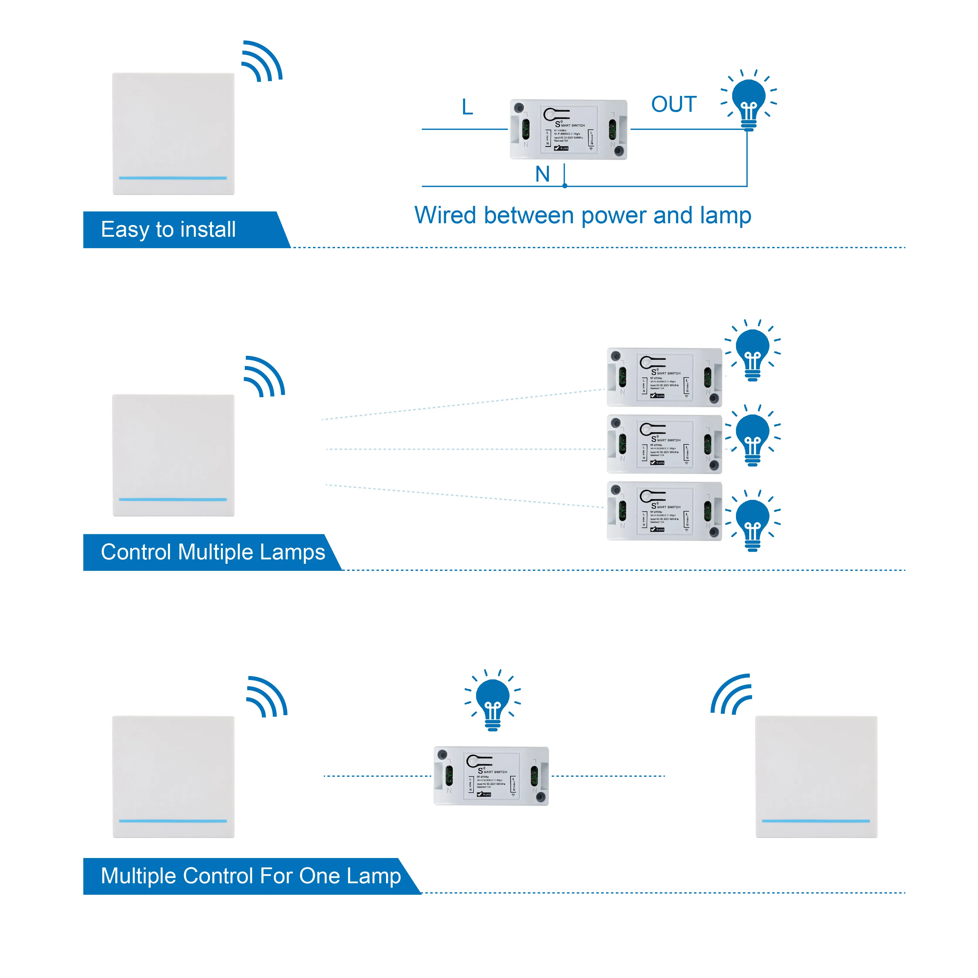 Этот смарт-переключатель может соединять только WIFI, затем может соответствовать радиочастотному дистанционному управлению 433 МГц. Этот смарт-переключатель имеет 3 режима работы, чтобы соответствовать радиочастотному пульту 433 МГц: (умный переключатель, далее именуемый: приемник)