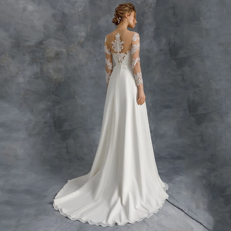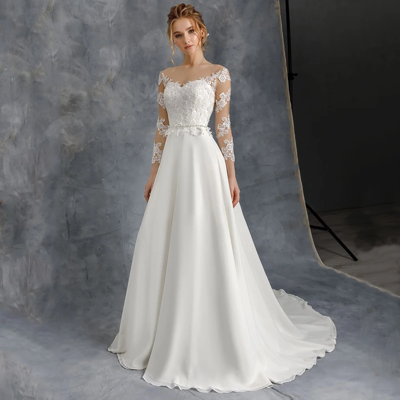 ТРАПЕЦИЕВИДНОЕ свадебное платье с рукавом 34, 2021, прозрачное кружевное шифоновое платье с круглым вырезом и аппликацией со шлейфом, длинное платье невесты в гражданском стиле с пуговицами