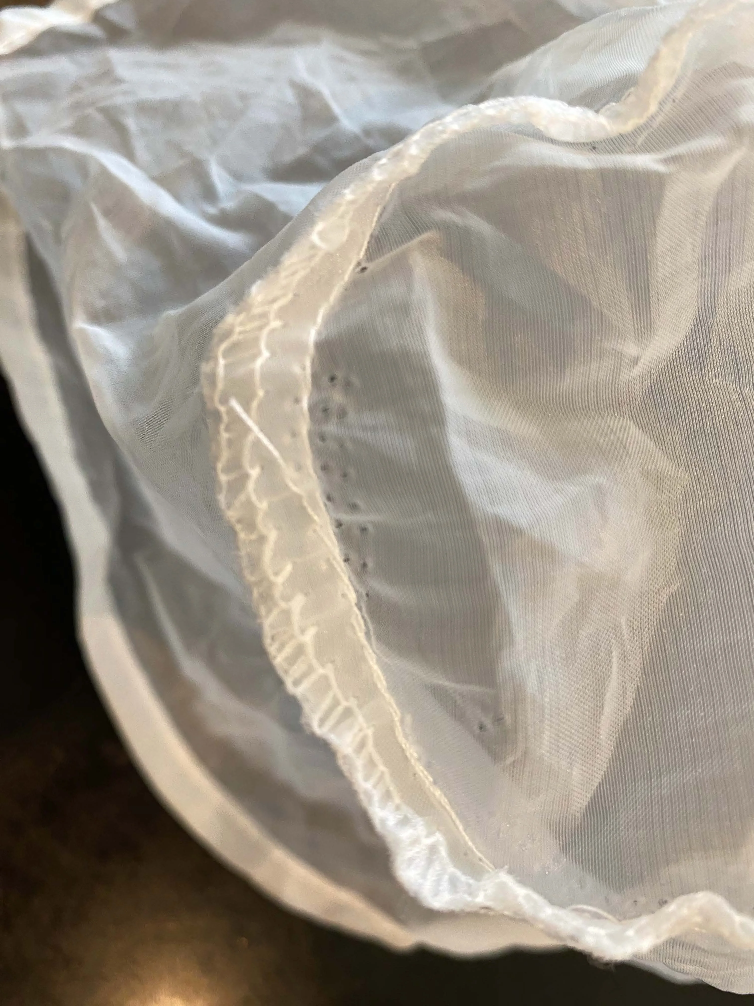 Фильтрующий сетчатый материал был хорошим, но швейная работа была чрезвычайно плохой. В швейных соединениях имеются отверстия, которые больше, чем в самой сетке, и это не устраивает цель создания тонкой сетки, см. Изображение. Товар не должен продаваться на рынке, если нет проверки качества.