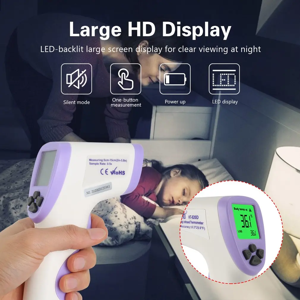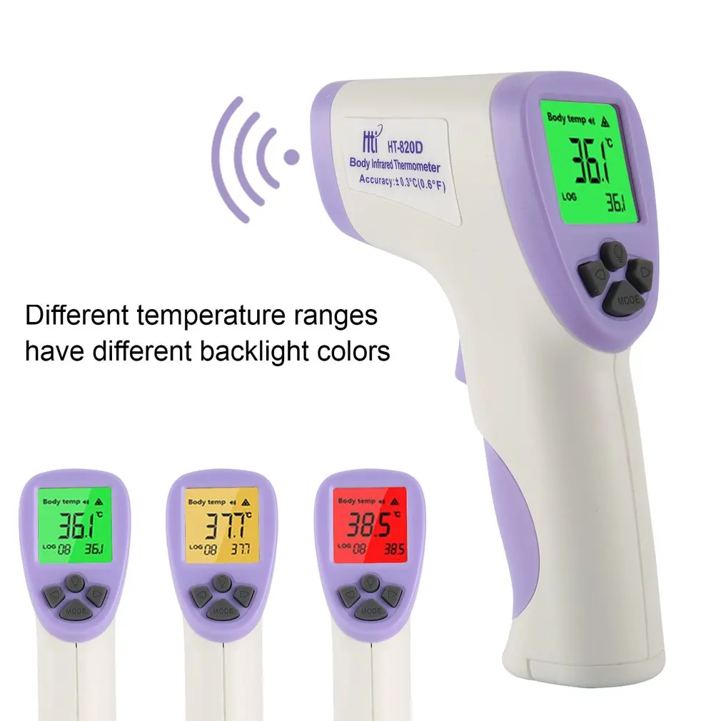 Этот продукт представляет собой портативный Бесконтактный инфракрасный термометр для тела с двумя режимами измерения: температура тела и температура поверхности тела. Его функции: Различные температурные диапазоны имеют различные цвета подсветки, автоматическое выключение и так далее.