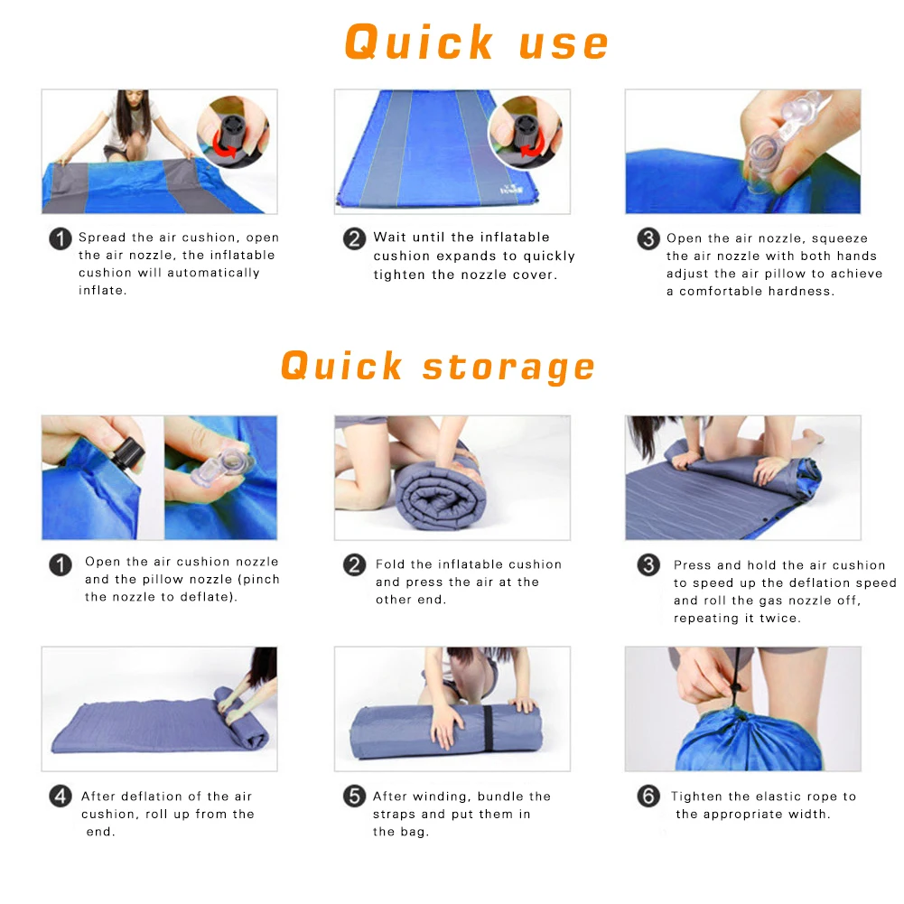 2. Быстрая автоматическая надувание: Откройте воздушную подушку, откройте воздушную насадку, надувная подушка автоматически надуется, просто нужно вручную надуть подушку, уникальная Автоматическая надувная подушка обеспечивает вам хорошее качество сна каждый раз, когда вы путешествуете.