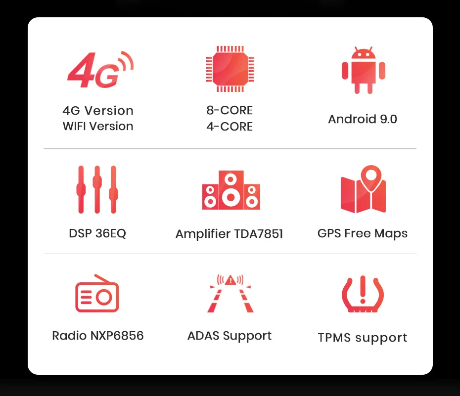 > 9 дюймов 2.5D емкостный Экран + 4 ядра 1,2 ГГц Процессор + DDR3 1 ГБ/2 ГБ/4 ГБ флэш-памяти (опционально) + 16 Гб/32 ГБ/64 Гб памяти (опционально) + встроенный Wifi (4G сеть опционально) + gps-навигация (Бесплатное обновление карты) + управление рулевым колесом + зеркальная связь + Bluetooth-Совместимость + Встроенный микрофон + FM/AM + RDS + Поддержка USB DVR ADAS + Поддержка Европейской DAB функции + 1080P видео воспроизведение + HD 1024*600 + Поддержка системы контроля давления в шинах > OSD языкРусский, английский, испанский, итальянский, французский, немецкий, китайский, эстонский, польский, филиппинский, финский, корейский, голландский, хорватский, латышский, литовский, румынский, норвежский, португальский, японский, шведский, тайский, турецкий, украинский, венгерский. > 7*24 часов обслуживанияВ Awesafe наша миссия упорно работает, чтобы предоставить вам надежный и замечательный Автомобильный мультимедийный плеер/автомобильное радио, инновационное оборудование и программное обеспечение, а также бесплатные обновления для прошивки, программного обеспечения, GPS навигационные карты.