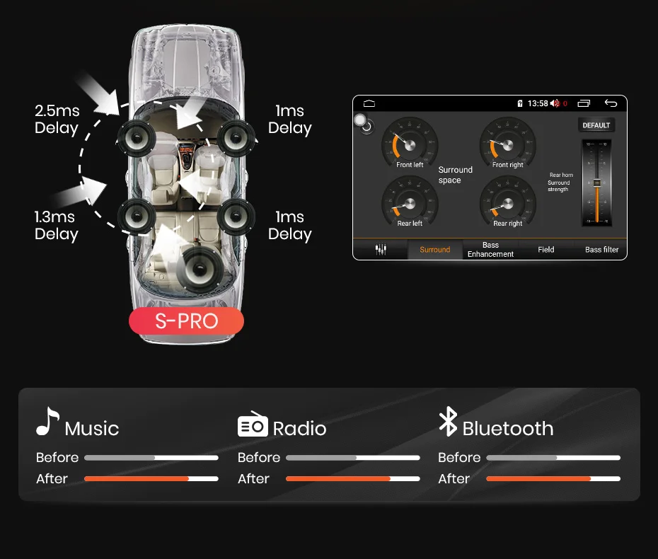 Благодаря встроенному усилению 4*45 Вт музыка звучит очень четко даже при высоких объемах.Вы можете настроить звук для ваших личных предпочтений, с 9 графический эквалайзер: поп, рок, джаз, Классическая, без каблука, пользователя, голоса и т. д.Несколько вариантов настройки позволяют вам наслаждаться звуком лучше.