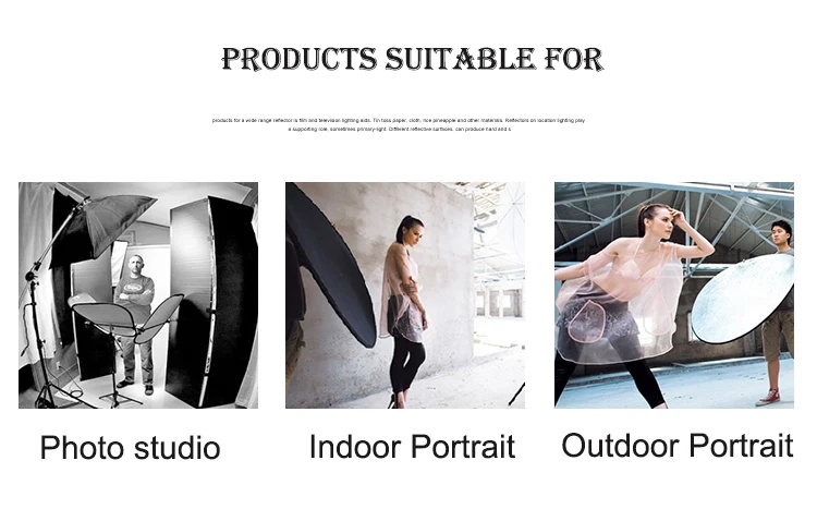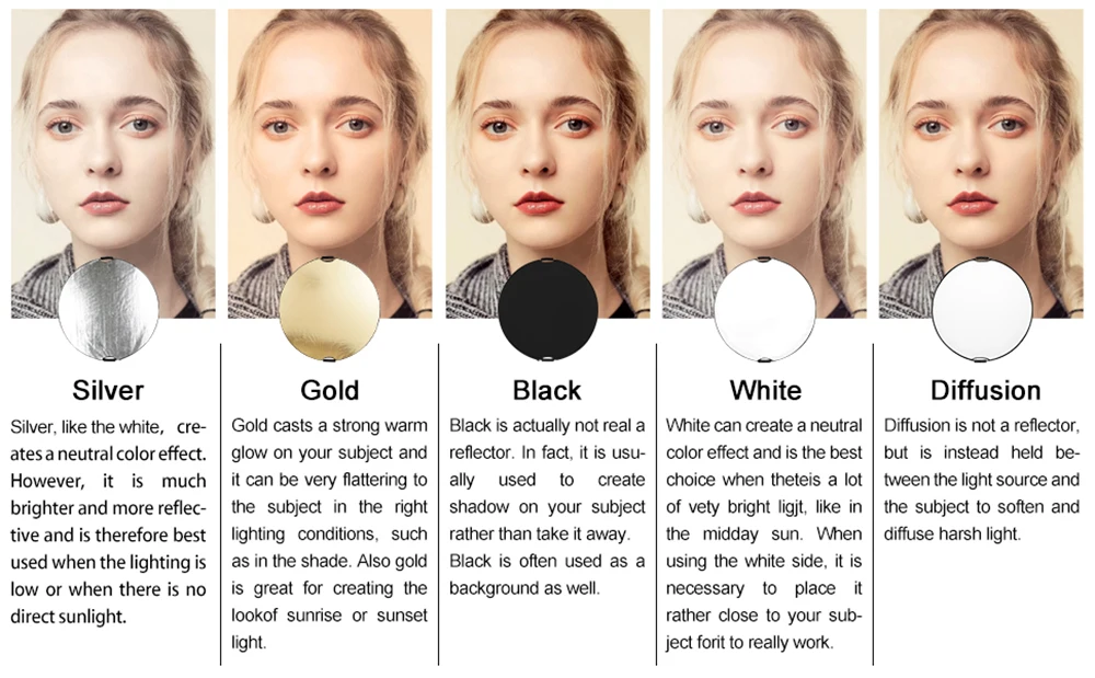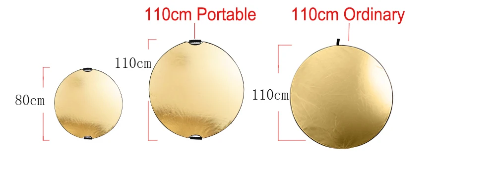 Цвет: золотой, серебряный, белый, черный, полупрозрачный отражательРазмер (диаметр):80 см/32 дюйма, 110 см/44 дюймаФорма отражателя: круглаяОтражатель посылка Размер: 25x25x10cmПосылка Вес: 0,8 кгFotografia эффекты различных отражателей:А-серебро: ярче картинкиB- Gold: теплые огниC-черный: уменьшение избыточного освещенияD-белый: Добавьте свет в тениE-прозрачный цвет: смягчающий светОсобенности продукта:5 в 1: золотой, серебряный, белый, черный и прозрачный.Отражатель с пятью различными отражающими поверхностями может использоваться для заполнения, отражения, диффузного, поглощающего или смягчающего светильник. Прочный и гибкий стальной каркас, его можно легко сложить в небольшой размер. В комплект входит двойной чехол на молнии для переноски. Отражатель светильник для фотосъемки диффузор 5 в 1 отражатель аксессуары для фотосъемки/светильник-рассеивательПримечание:Качество опорного стального стержня для отражателя лучше, а эластичность также большая. Пожалуйста, обратите внимание на эластичность при разворачивании и не подпрыгивайте к себе или другим.80 см 110 см 5 в 1 светильник, отражатель, ручной держатель, мульти складной портативный светильник круглый отражатель-диффузор, фотография для студии