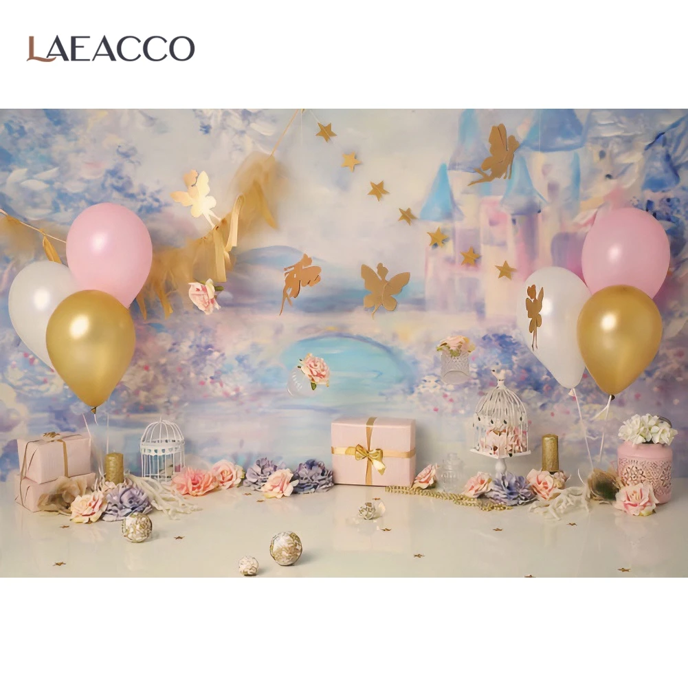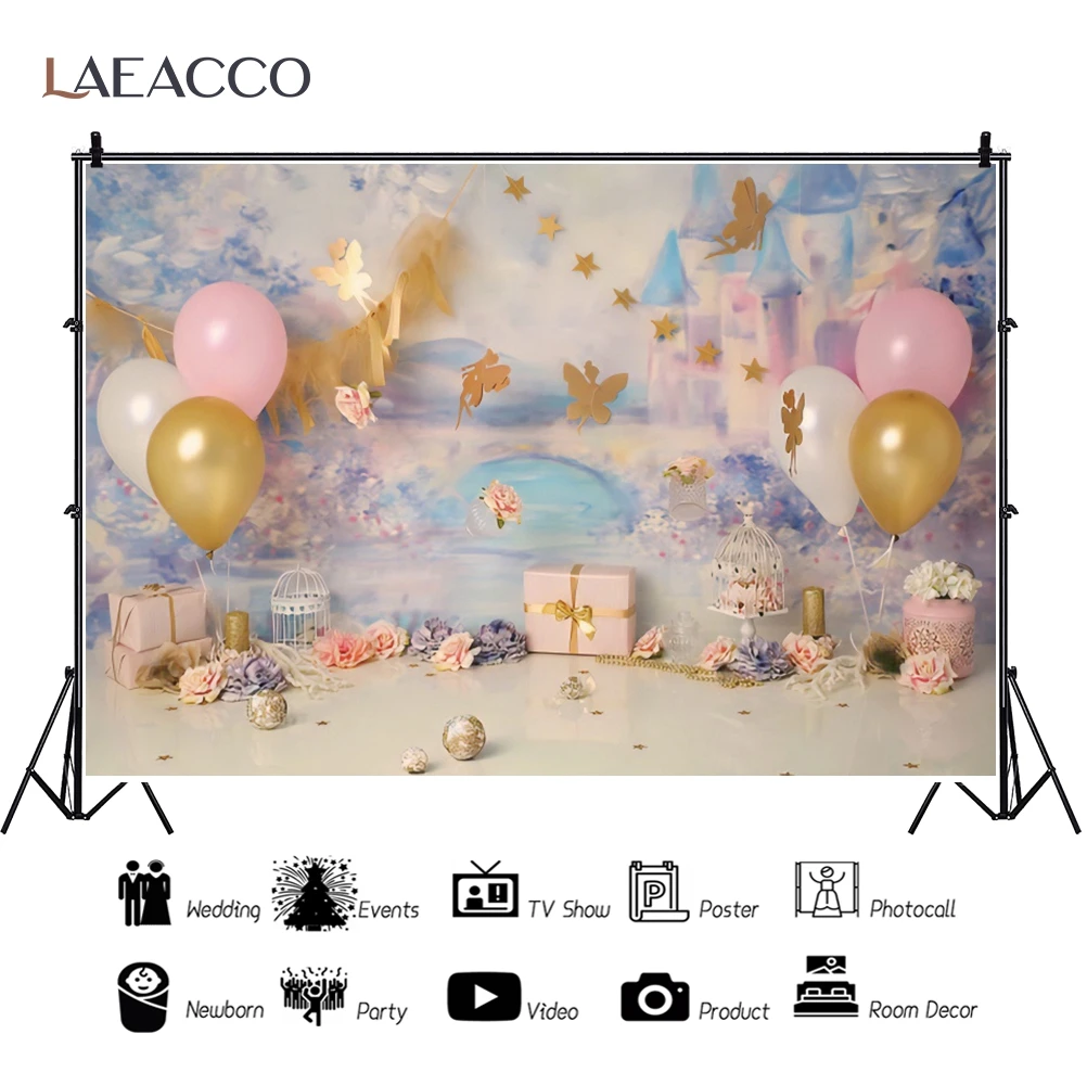 Laeacco розовые воздушные шары замок эльф девочка принцесса ребенок душ фотография Фон День рождения баннер для фотосъемки студийный фон