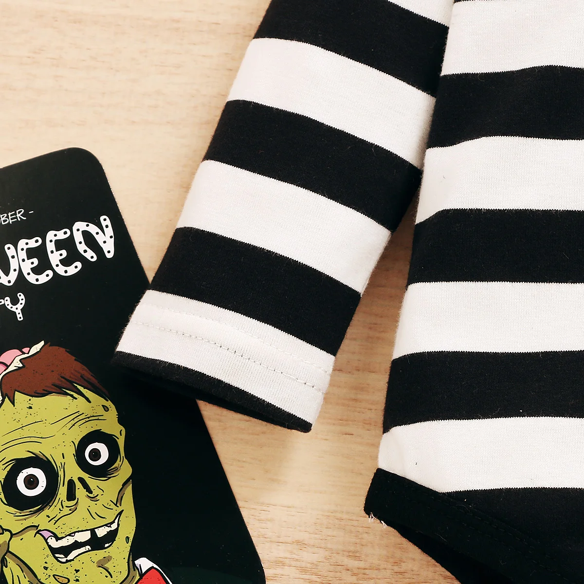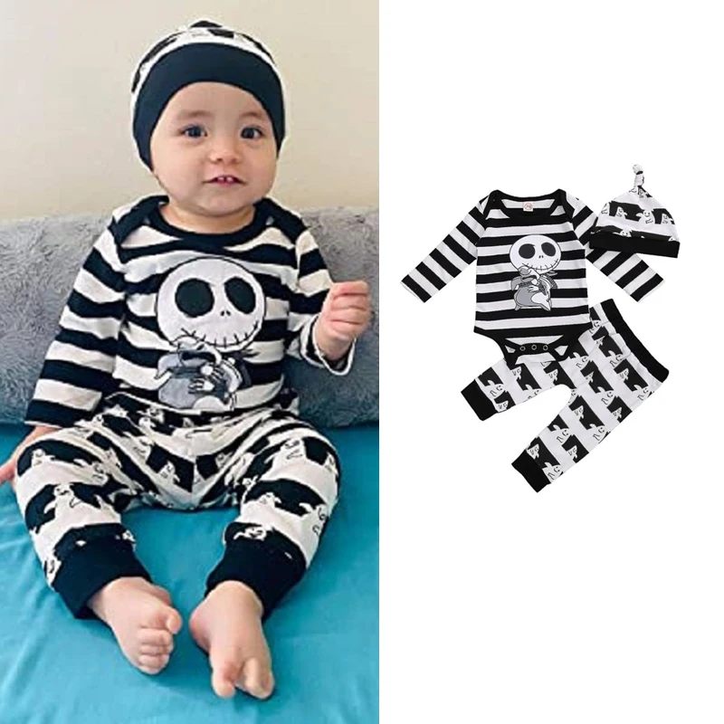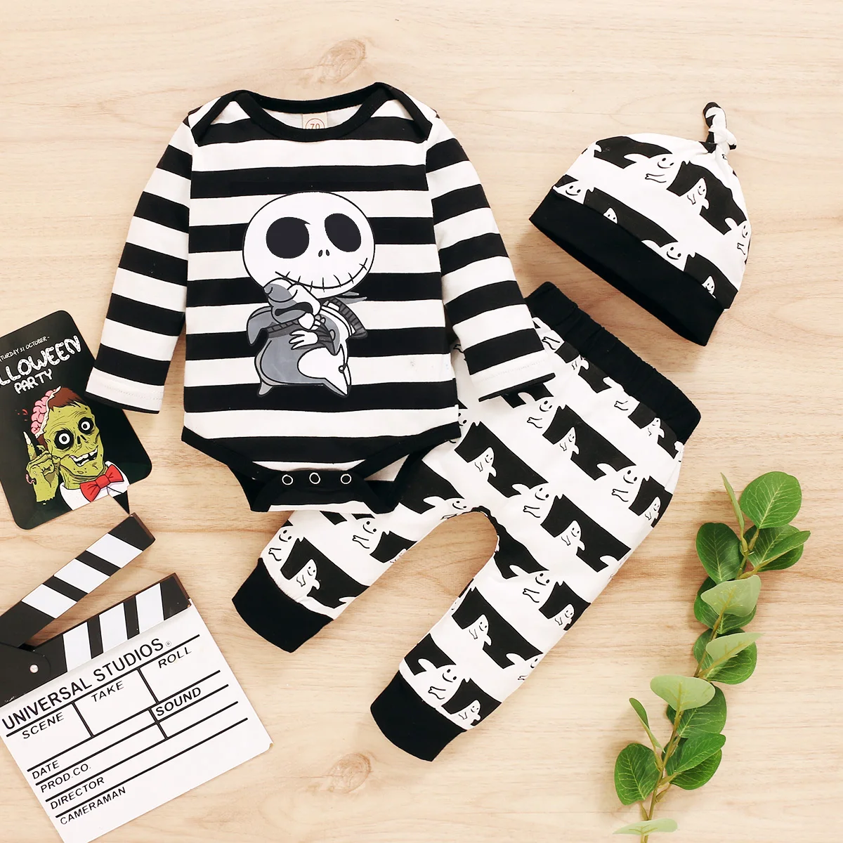 На Хэллоуин, комплект из 3 предметов для малышей, платье для девочек в полоску Одежда для маленьких девочек; Детский комбинезончик с длинными рукавами + штаны + Шапки наряды