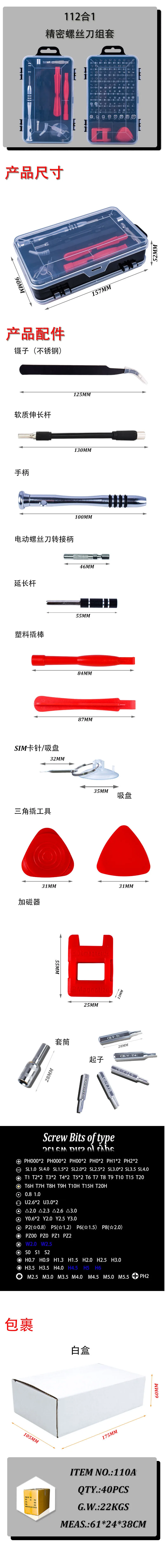 Название продукта: Набор прецизионных инструментов для ремонта Материал изделия: углеродный сплав Характеристики продукта: 115/122/135 шт Упаковка продукта: коробка для инструментов + картонная упаковка Вес продукта: 0,7 кг