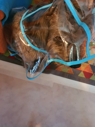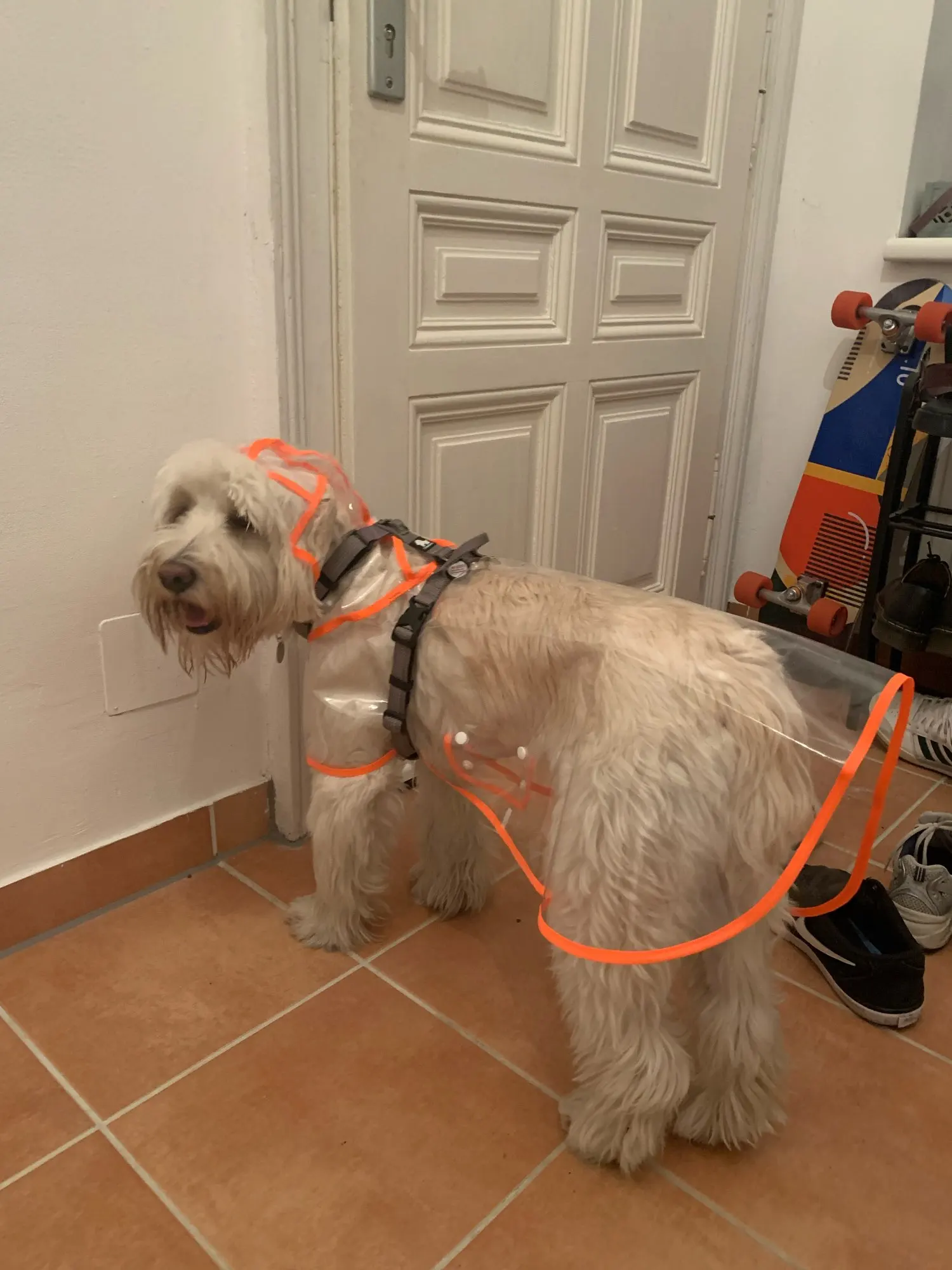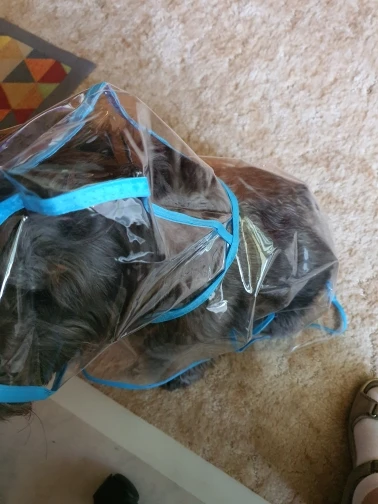 Брала не собаку весом 12 кг, чтобы хорошо прикрывал хвост, с запасом. Слегка великоват капюшон, но его можно подвернуть легко. Нет вырезов под карабин поводка, но легко надеть сверху шлейку. Не сползает. Покупкой очень довольна