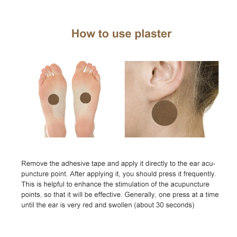 Способ применения:Очистите ушные точки чистой водой перед использованием, удалите пластикПодкладки при использовании, и наклеить лечебный пластырь за точки уха.Одна деталь может применяться на 8-12 часов.