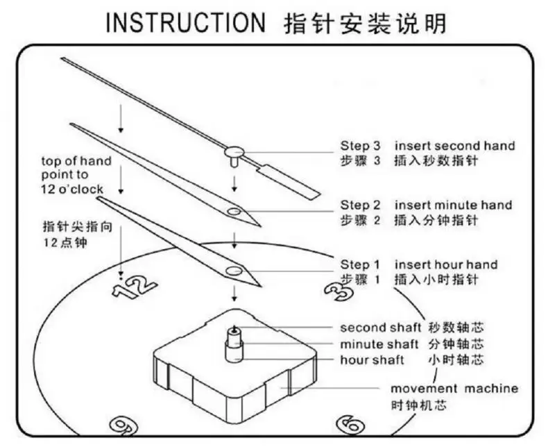 Один комплект включает в себя часовую стрелку длиной около 6,5 см, минутная стрелка около 9 см, и вторую руку вокруг пятки около 12 см в длину. Один набор винтов