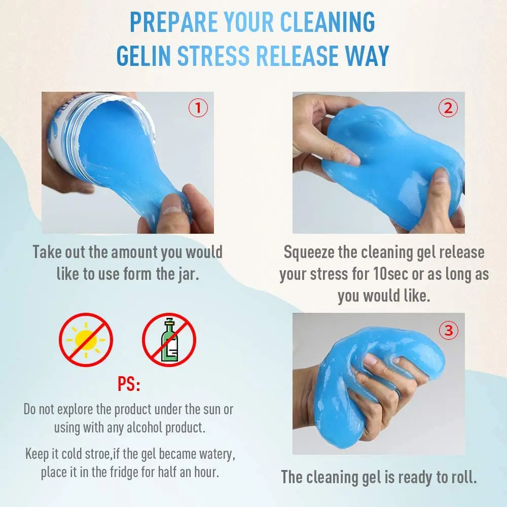 Преимущества чистящего геляГель для чистки клавиатуры изготовлен из растительной резины.Не липнет к руке, не раздражает кожу, не оставляет токсичных веществ, не вредит окружающей среде.Этот Чистый гель может проникать в каждый уголок, чтобы тщательно очистить ваши устройства 95% грязи, крошки.Этот шлам для очистки пыли может быть повторно использован.Этот многофункциональный гель для чистки клавиатуры подходит для всех типов оборудования.Как использовать:1. Держите руки сухими перед использованием очищающего геля.2. Возьмите кусочек чистящего геля и аккуратно разминайте его несколько раз.3. Поместите его на очищенную поверхность.4. Аккуратно сожмите и скрутите его примерно 4-5 раз, затем медленно вытяните. (Пожалуйста, не кладите его на клавиатуру в течение длительного времени.)5. Закройте чистящий гель в маленькой коробке в хорошее время после использования.Пожалуйста, обратите внимание, что продукт не может храниться в машине летом, если вы поставите его в высокой температуре, это станет липкой слизи!