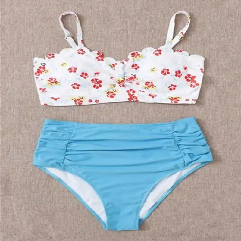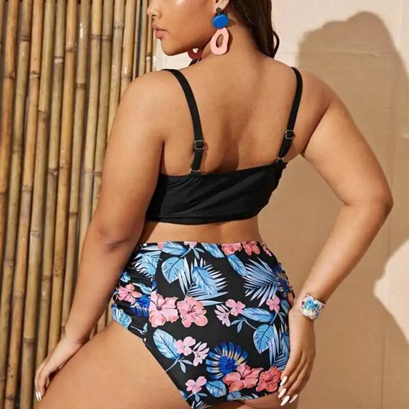 Размера плюс бикини с высокой талией, комплект из 2 предметов, женский купальник с оборками, пикантный купальник с цветочным принтом и высокой талией