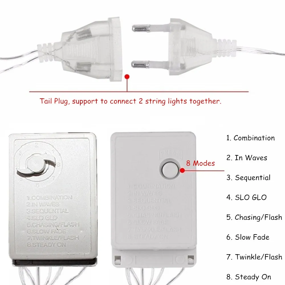 Тип: светодиодный светильникМатериал: пластикСветильник Цвет: теплый белый/холодный белый/синий/мульти ЦветИсточник питания: 220 В AC EU вилка/110 В US вилкаКоличество СВЕТОДИОДНЫЙ: 40 светодиодный/100 светодиодный/200 светодиодный/300 светодиодныйДлина: 6 м 10 м 20 м 30 мВодонепроницаемость: Да (Примечание: блок управления и вилка не являются водонепроницаемыми)Цвет шнура: ПрозрачныйМатериал проволоки: мягкий пластиковый канат, мягкий и гибкий, шпагат в любом месте, которое вы можете себе представитьРежим работы:-220 В штепсельная вилка европейского стандарта/110 В штепсельная вилка американского стандарта: 8 режимов (1. Комбинация 2.In wave 3. Последовательный 4. Переменный 5. Чеканка/Вспышка 6. Медленное выцветание 7. Мерцание/Вспышка 8. Устойчивый)
