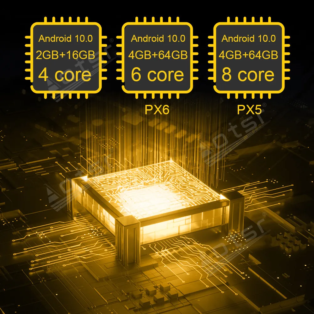 1».Android 10,02».2 Гб RAM 16 Гб ROM, 4 ядра3».PX5 4 Гб RAM 64 ГБ ROM, 8 ядер4».PX6 4 Гб RAM 64 ГБ ROM, 6 ядер