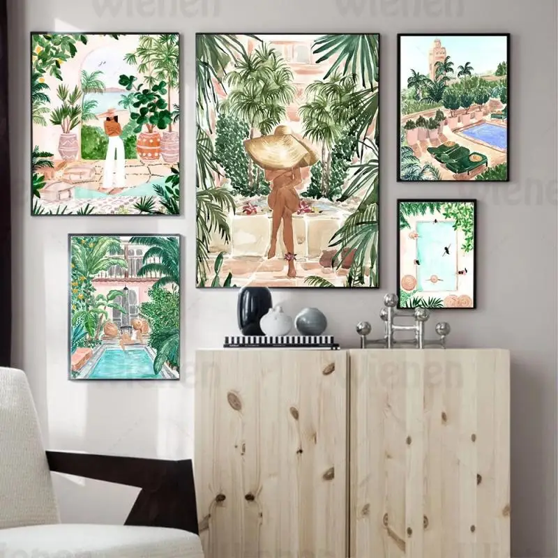 Скандинавская живопись холст мирный марокканский отпуск девушка иллюстрация плакаты и принты отель плавательный бассейн курорт лобби домашняя Декорация