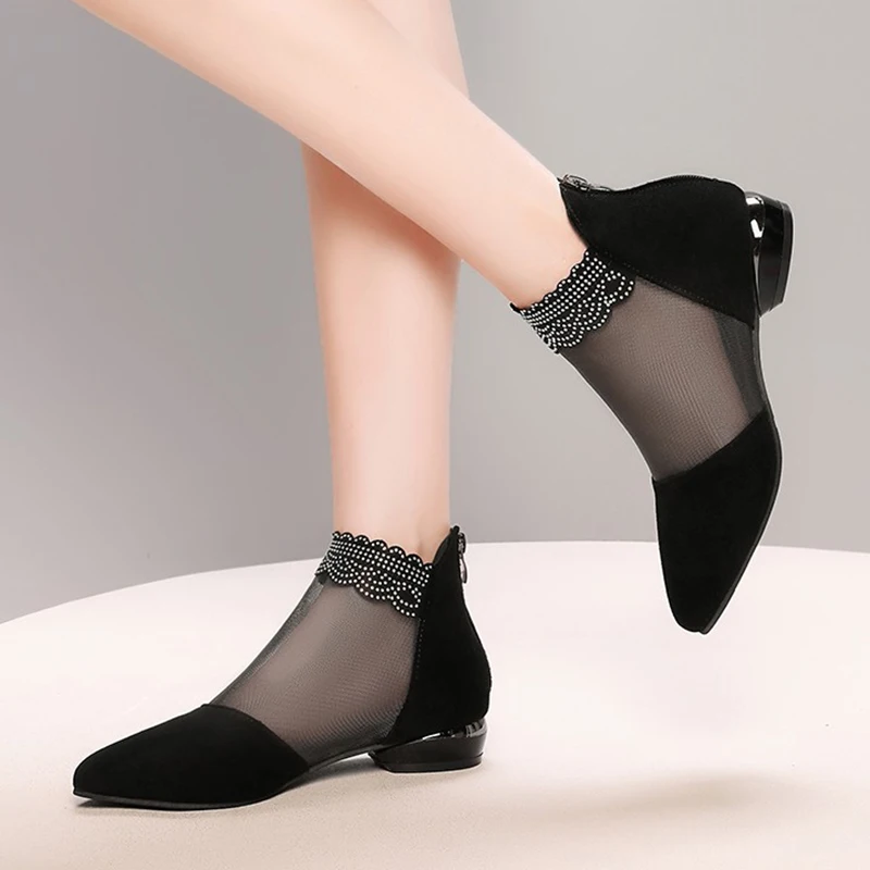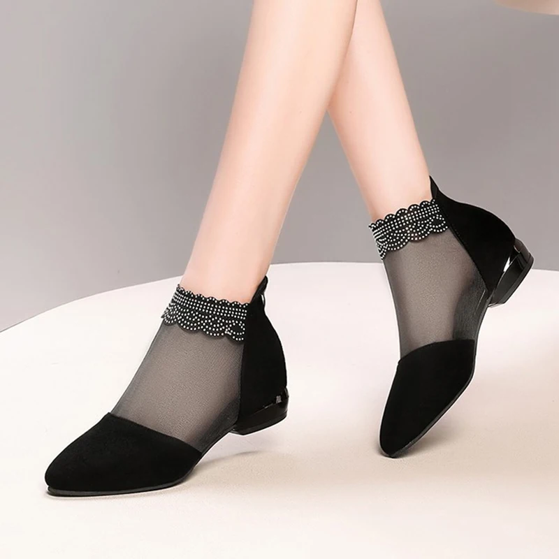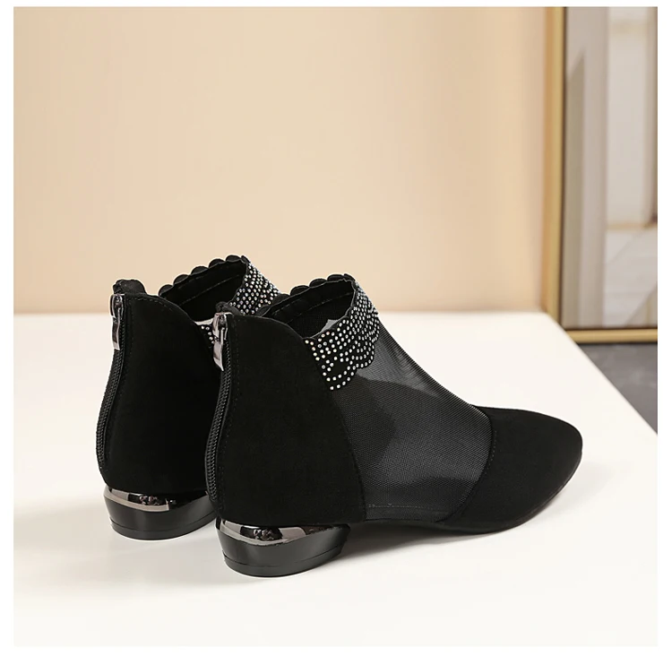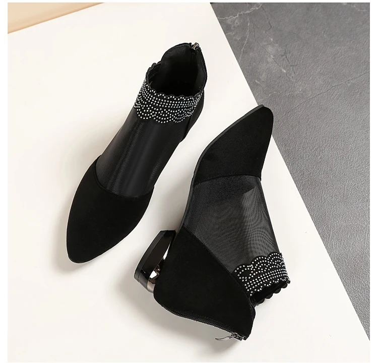 Женские ботинки с открытым носком, босоножки-гладиаторы с острым носком, сетчатые ботильоны с кристаллами, Классическая обувь на низком каблуке с молнией сзади, модель 9099N на лето, 2021