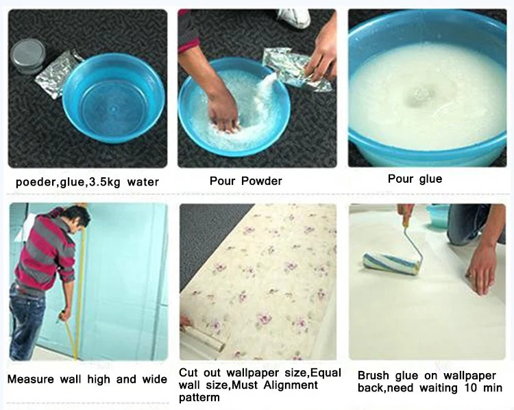 Инструкция по применению:1. Убедитесь, что у вас правильный клей. Для некоторых бумаг, таких как виниловая подложка или легкая бумага, требуются специальные пасты.2. Смешайте порошкообразную обойную пасту в отдельном ведре, а затем Высыпьте ее в ведро или барабанный лоток для использования для работы. Хорошо размешайте с батончиком для удаления всех комочков, но помешивание недостаточно хорошо, чтобы в смесь всасывалось много воздуха.3. Высыпать жидкий клей непосредственно в ведро или лоток для роликов.4. Положите отрезанный до определенного размера кусок обоев и рисунок смотрит вниз на длинный и плоский сухой стол (стол нельзя долго держать сухим). Проведите один конец бумаги по краю стола.5. Используйте Кисть для нанесения пасты или валик для рисования, чтобы нанести пасту на плоскую половину бумаги на стол, убедитесь, что каждый дюйм покрывается.6. Сложите только что наклеенную часть, а затем проведите сухой частью бумаги на стол. Нанесите пасту.7. Сложите следующую часть на себя, затем Сложите две половинки вместе, стараясь не мять бумагу. Этот процесс называется "подпиской". Бронирование билетов может сохранить бумагу влажной, паста не капает на пол и поверхность пасты чистой.8. Перед тем как повесить бумагу, пожалуйста, положите ее в чистое место не более 5 минут.9. Держите его в чистоте: после того, как вы закладываете все обои и откладываете их в сторону, используйте чистую влажную губку для очистки стола-но не нарушайте сушку поверхности. Сделайте это, даже если вы хотите вставить несколько кусочков перед приостановкой. Его нужно снять со стола до того, как клей высохнет.