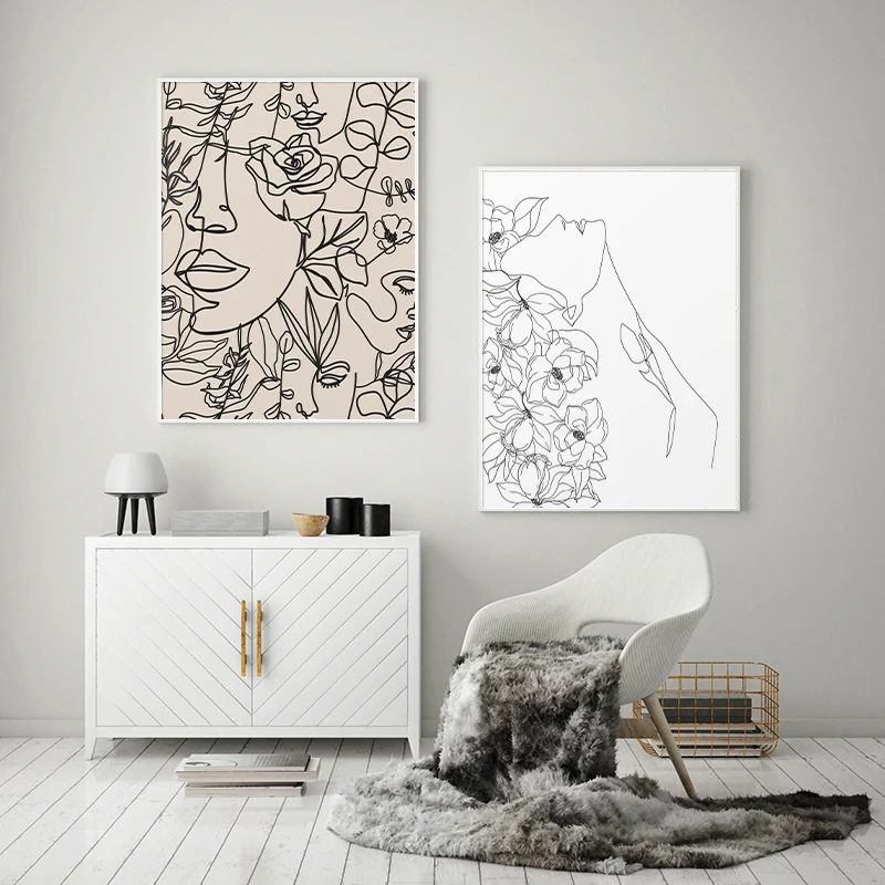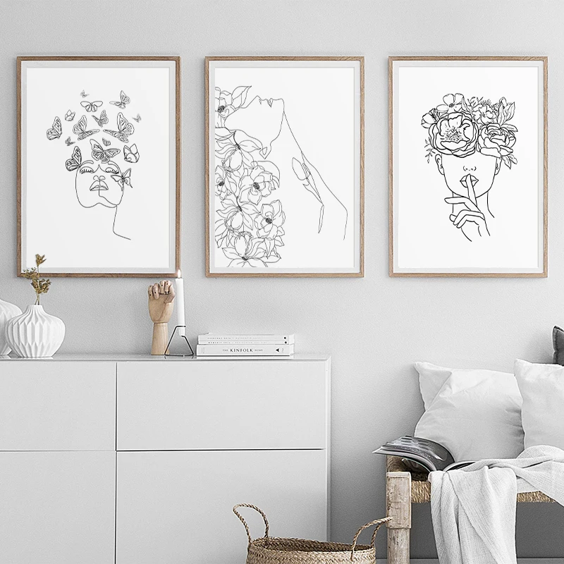 Абстрактная голова цветов, линия лица, рисунок, женщина с бабочкой, плакат, настенные художественные картины для гостиной, украшение для дома