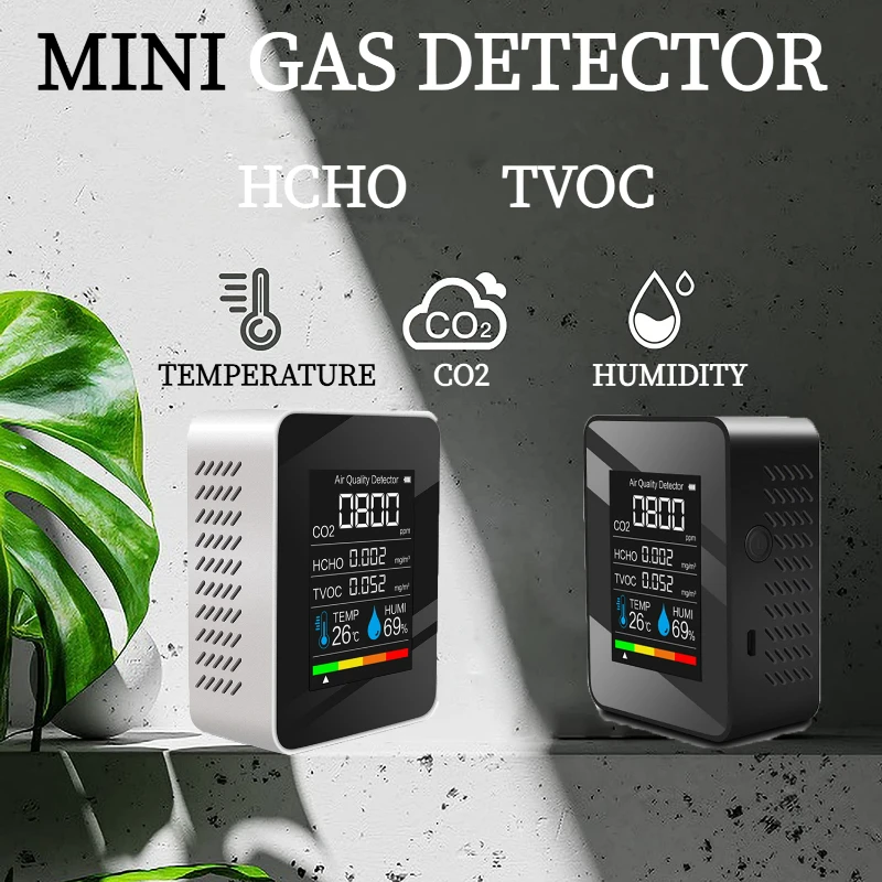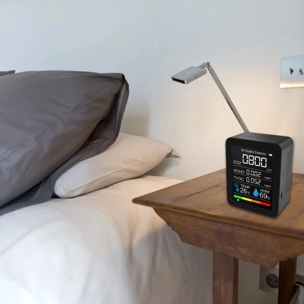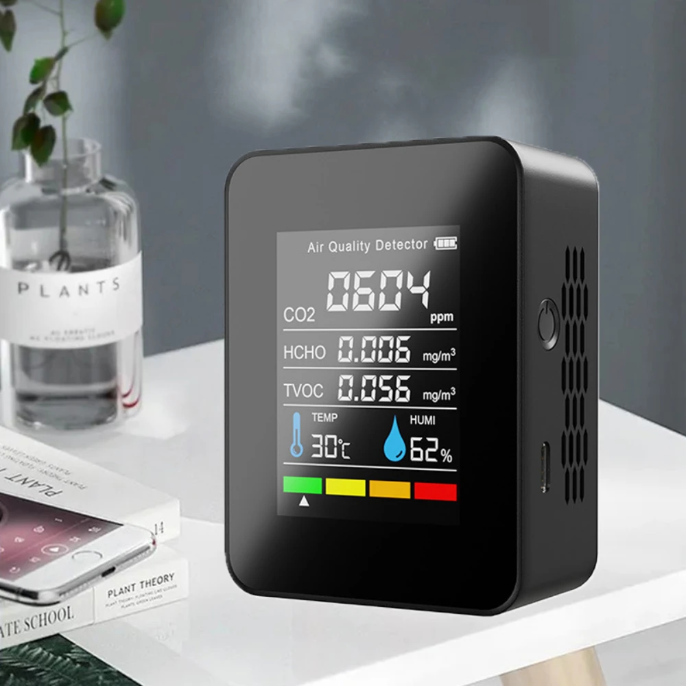 Большой ЖК-дисплей, вы можете видеть количество электроэнергии, значение CO2, значение TVOC, значение HCHO, температуру и влажность четко.