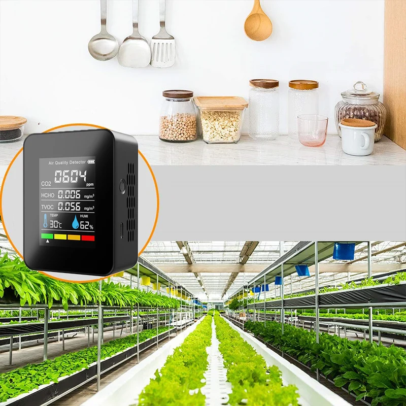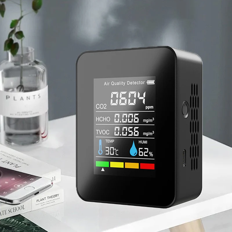 Это своего рода качественный детектор качества воздуха, компактный размер, легкий и портативный. Принимает большинство высокоточных датчиков TVOC, обнаружение в реальном времени, автоматическое обновление данных, с мульти-использованием. Большой ЖК-дисплей, вы можете видеть количество электроэнергии, значение CO2, значение TVOC, значение HCHO, температуру и влажность четко. Широкое применение: сельскохозяйственная посадка, тепличные овощи, производственный склад, обработка материалов, домашний интерьер, офисы и т. д.