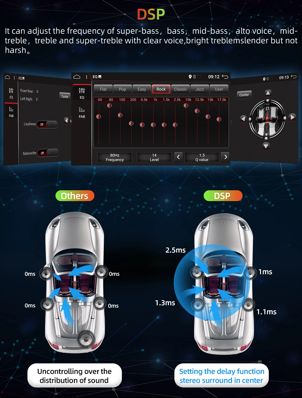 DSP + сенсорный экран + радио + FM/AM + RDS + gps-навигация + карта + Wifi + Bluetooth + управление рулевым колесом + сплит-экран + USB + SD + AUX вход/выход + зеркальная ссылка + камера заднего вида + сабвуфер + Play Sore + EQ + набор обоев + логотип автомобиля + 3G/4G + TPMS + DAB + OBD 2 + DVR + TV