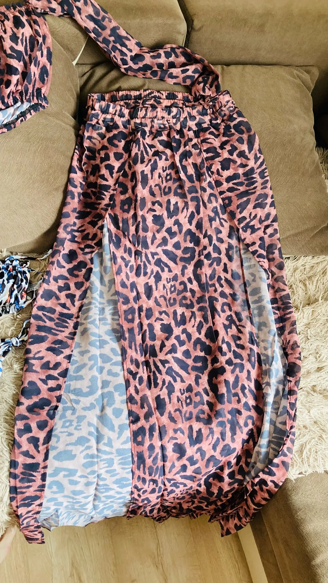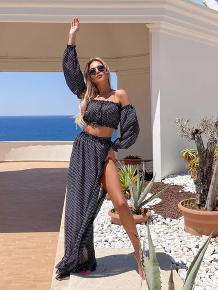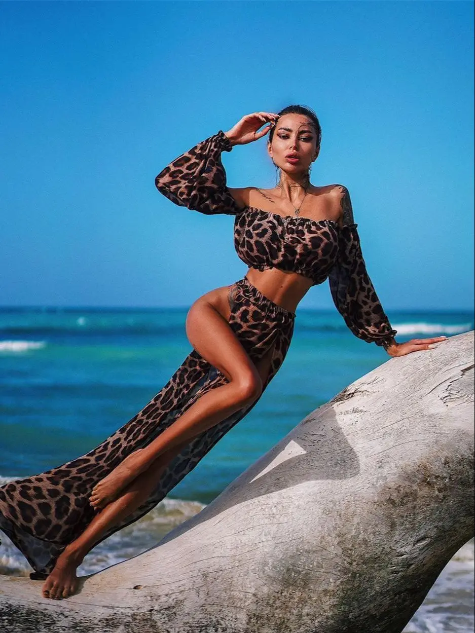 Леопардовая накидка на бикини, женские комплекты из двух предметов, сетчатый прозрачный короткий топ с открытыми плечами + раздельная юбка, пляжная сексуальная женская накидка для купания