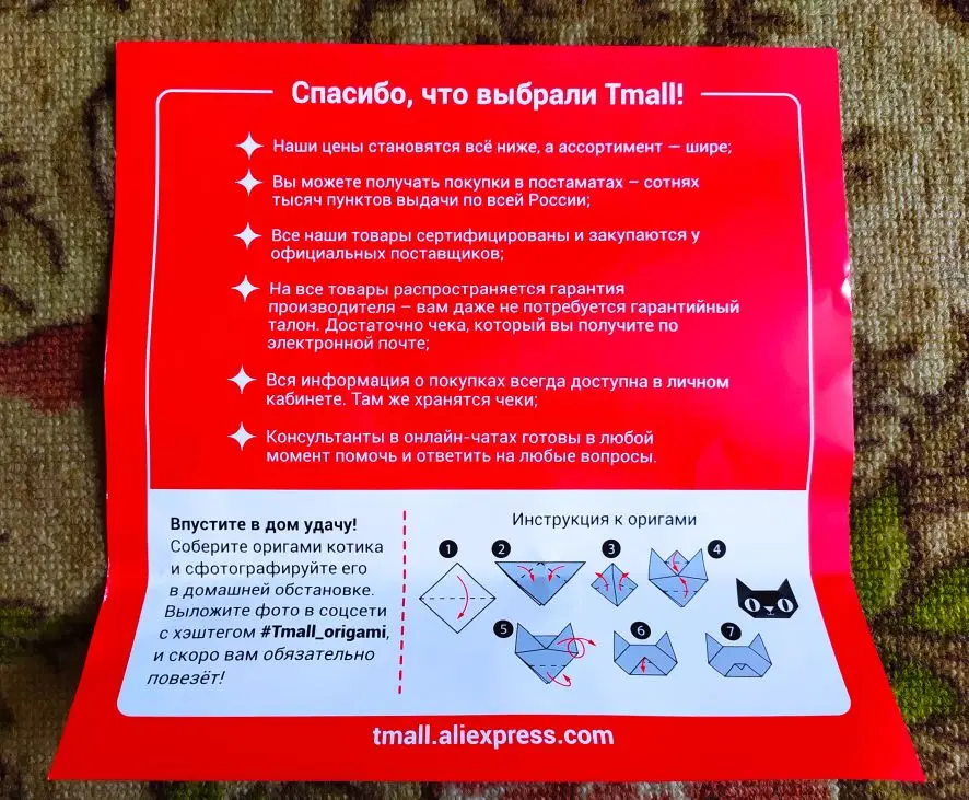 заказал 23.04.21г за 130р по временному купону магазина. пришло 27.04.21г. упаковано отлично, в подарок положили оригами морду кошки символа тмалл. всем доволен