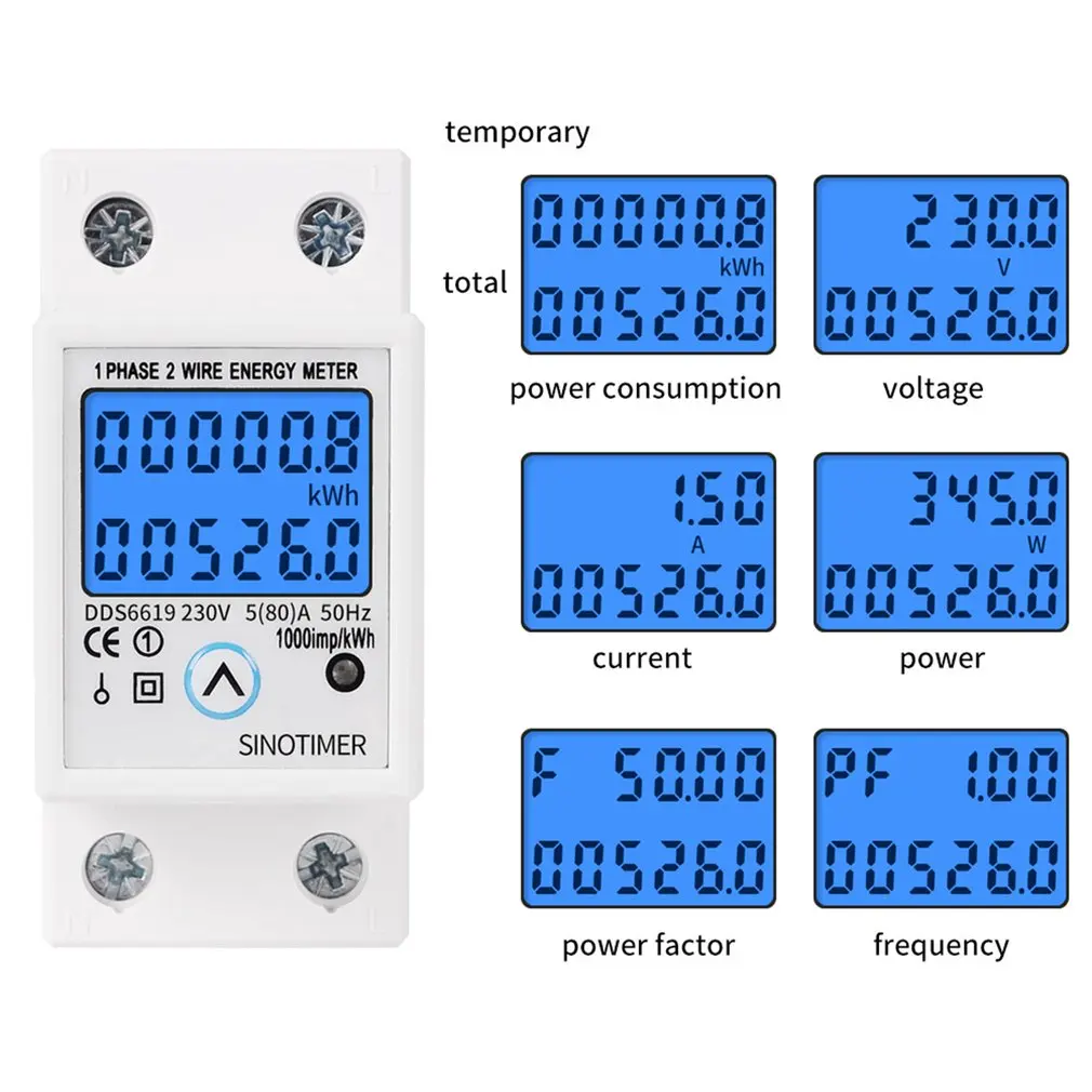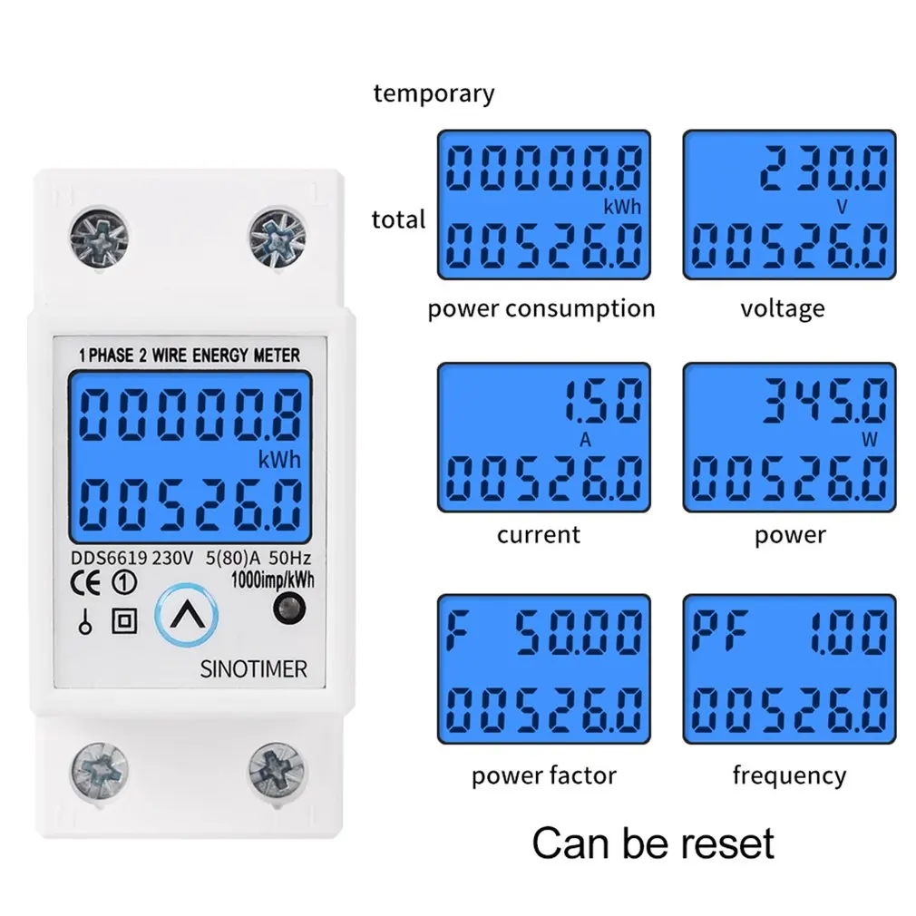 Счетчик представляет собой многофункциональный дисплей общей энергии кВт-ч, кВт-ч временной энергии, настоящего напряжения, настоящего тока, реальной мощности при ручном давлении.Удерживайте кнопку в течение 6 секунд, чтобы сбросить временную кВтч.