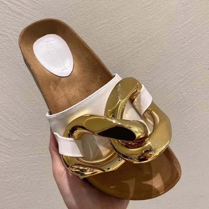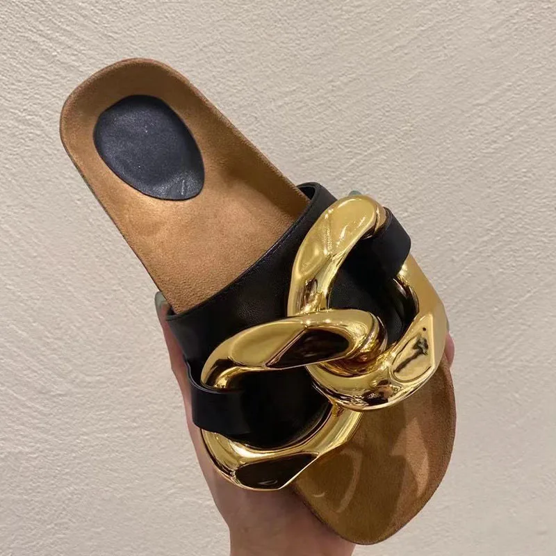 Шлепанцы женские с золотистой цепочкой, пляжная обувь, открытый носок, без застежки, сланцы, летние сандалии, 2021