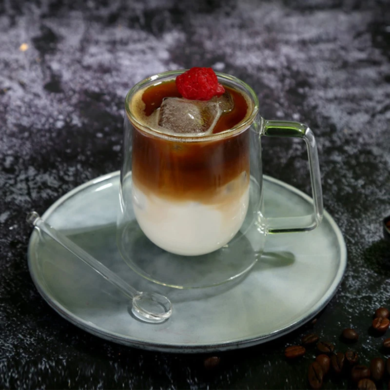 Чашка стеклянная с двойными стенками и ложкой, прозрачная, в европейском стиле