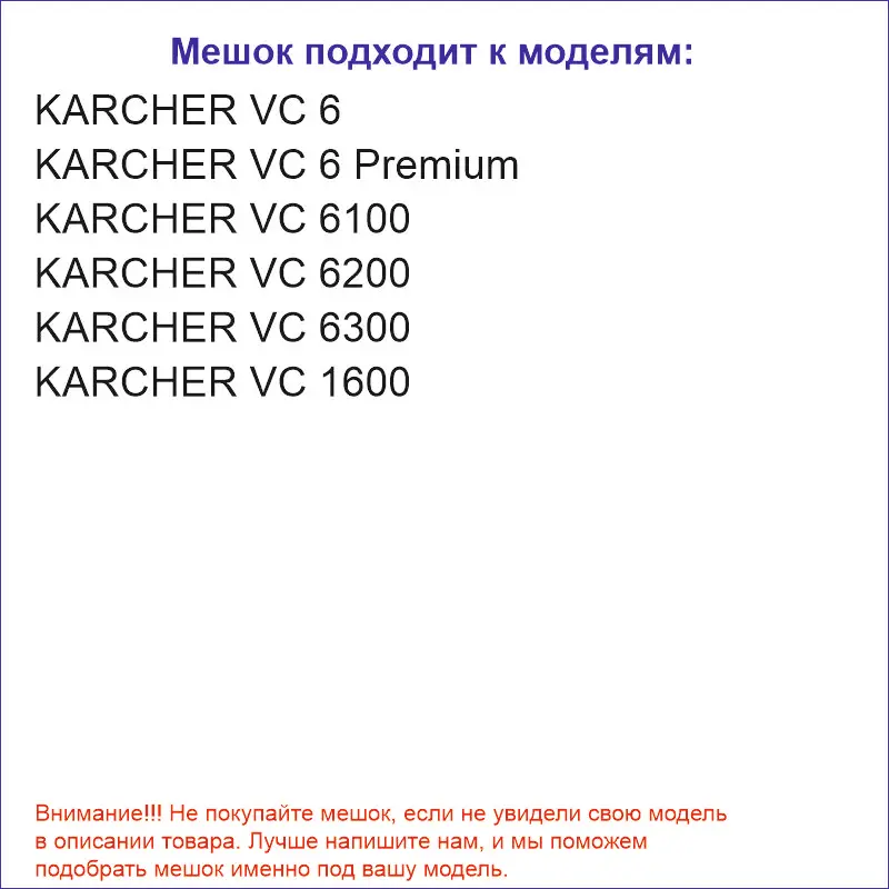 Мешок подходит к следующим моделям:KARCHER VC 6KARCHER VC 6 PremiumKARCHER VC 6100KARCHER VC 6200KARCHER VC 6300KARCHER VC 1600Материал мешка: