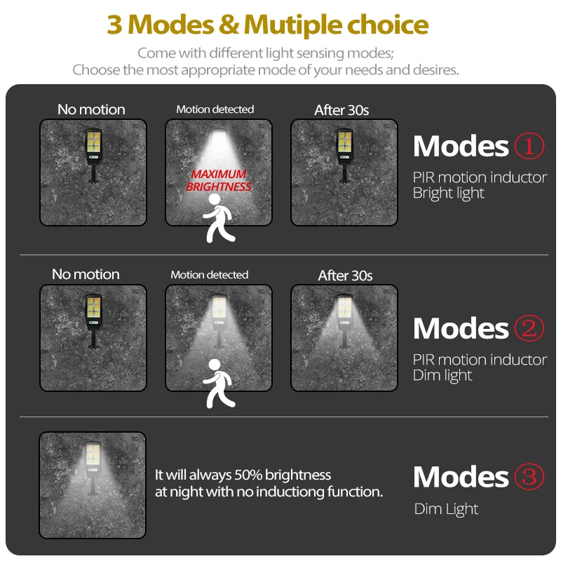 Кнопка РЕЖИМ освещения:-Выключение: режим выключения, индикатор красный;-Первая передача: некоторые люди приближаются, ярко загораются в течение 15-30 секунд, когда ни один не выключается;-Вторая передача: некоторые люди приближаются, ярко светятся в течение 15-30 секунд, и когда их нет, свет всегда яркий и слабый;-Третий механизм: независимо от того, нет ли там кого-то, и слабый свет всегда горит.Время зарядки: 6 часов на солнцеУгол чувствительности PIR: 120 °Расстояние срабатывания: 8-10 метров