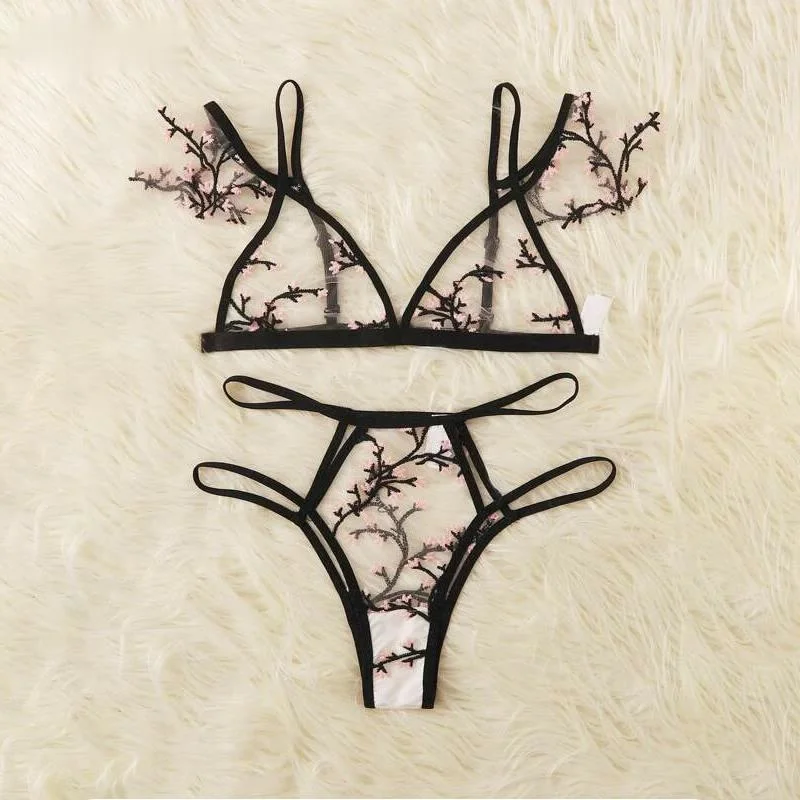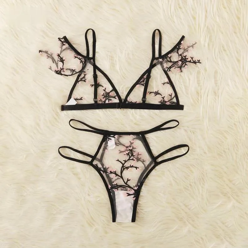 Product descriptionFloral Embroidery Mesh Lingerie Set