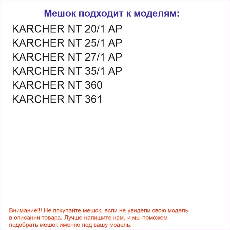 Мешок подходит к следующим моделям:KARCHER NT 20/1 APKARCHER NT 25/1 APKARCHER NT 27/1 APKARCHER NT 35/1 APKARCHER NT 360KARCHER NT 361