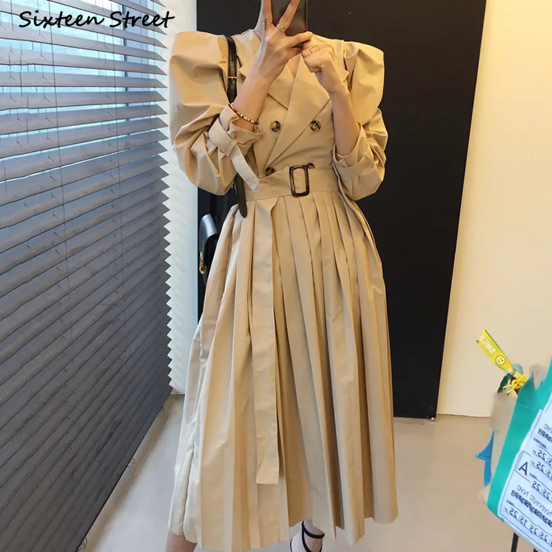 Женское винтажное плиссированное платье макси, элегантное двубортное платье цвета хаки с поясом и высокой талией, 2019