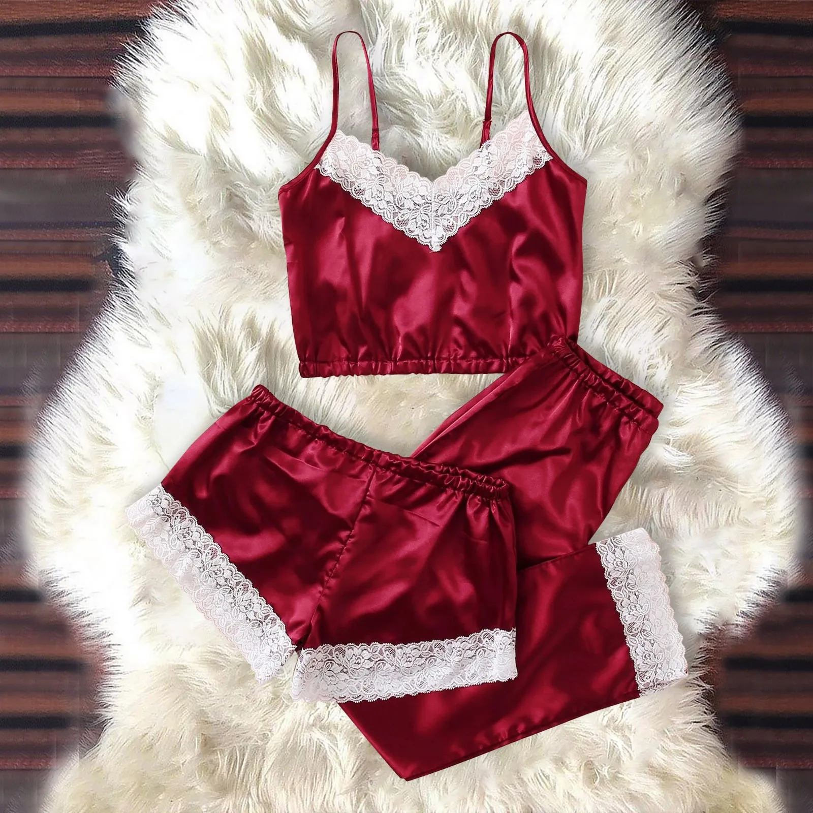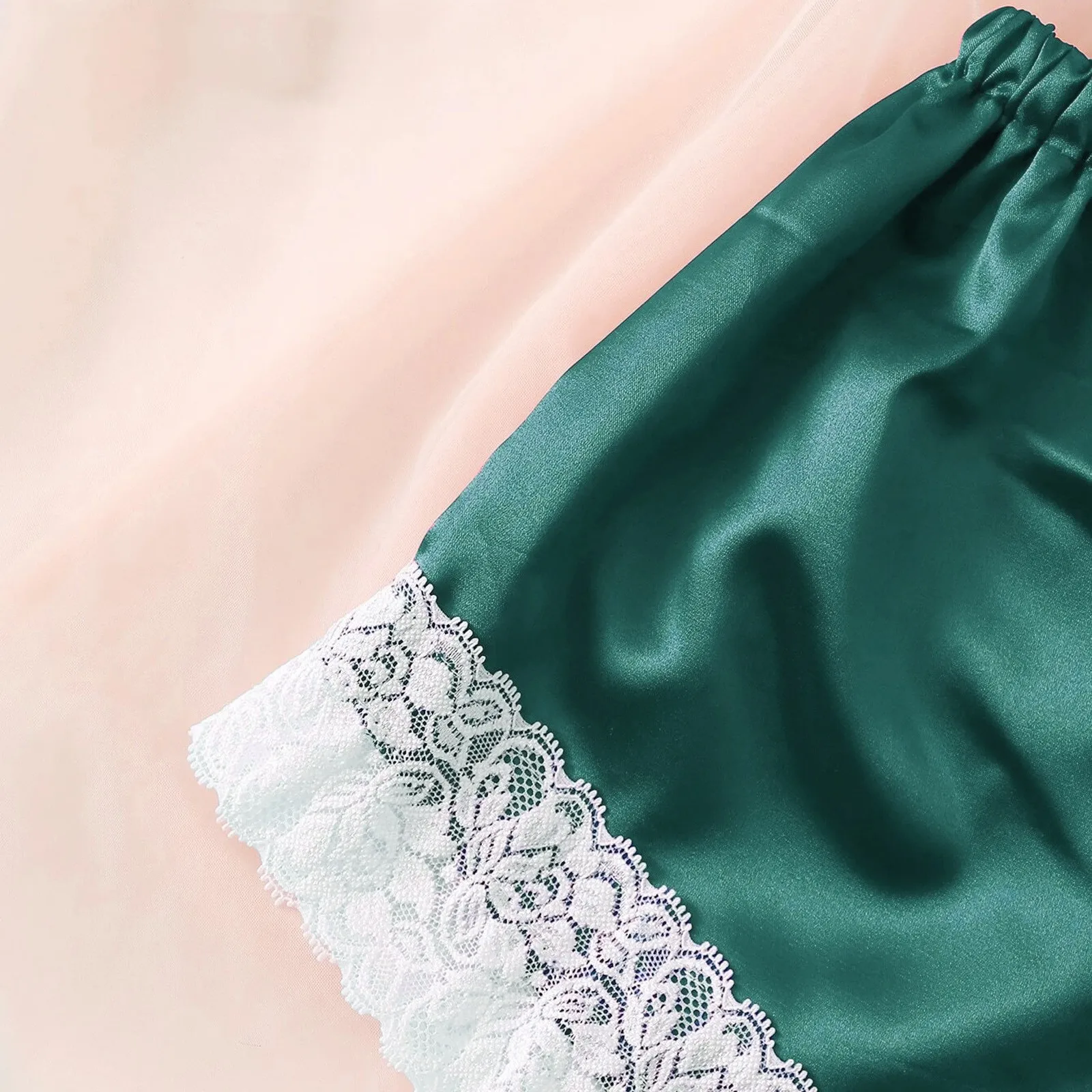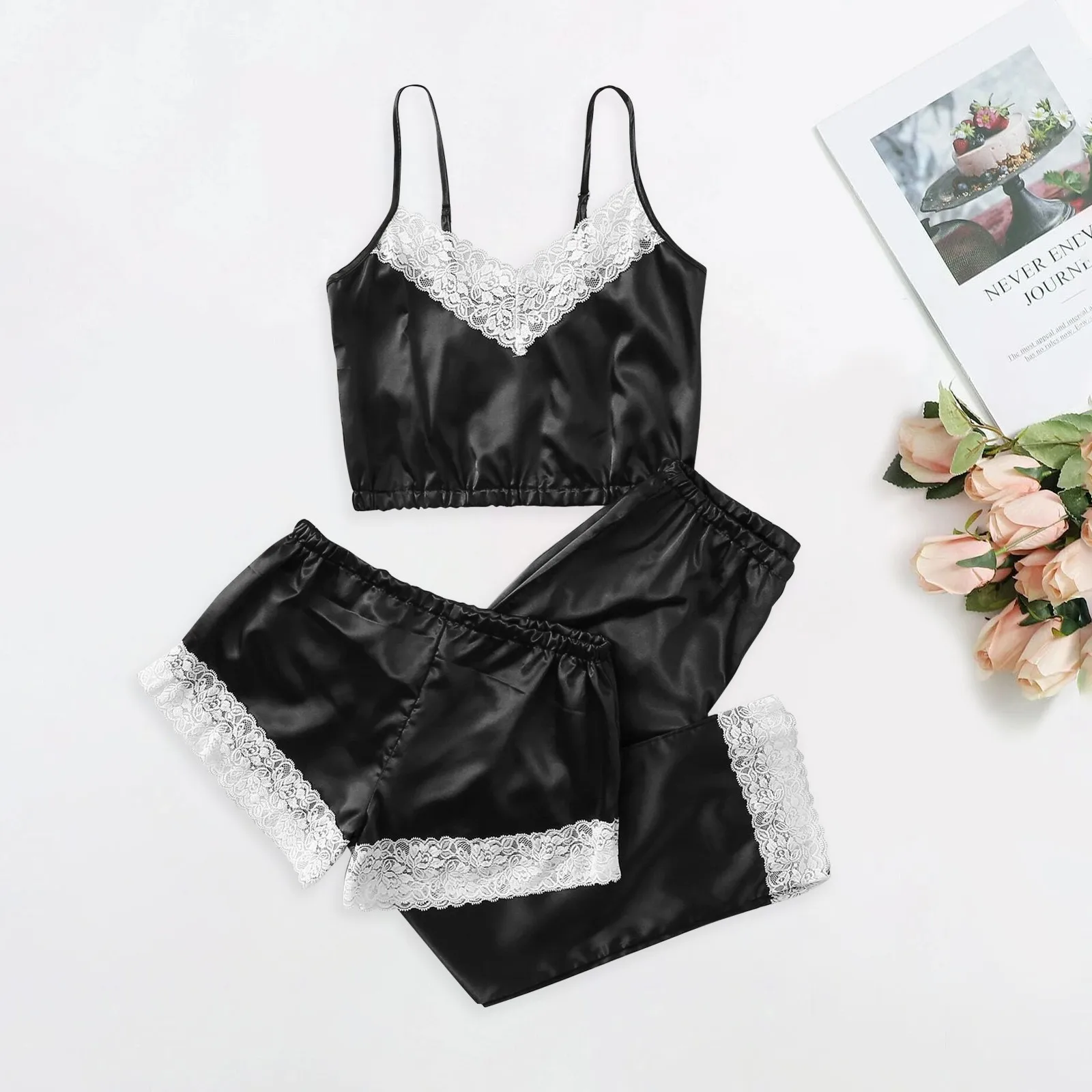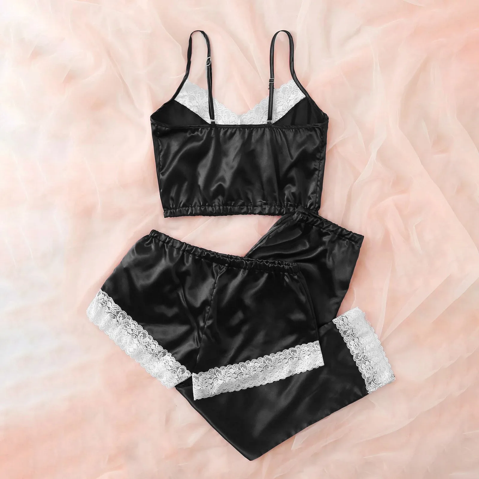 Ресничками комплект кружевной пижамы Для женщин с v-образным вырезом и кружевным рисунком камзол пижамы шорты с бантиком комплект Пижама сатин Mujer пижамные комплекты Pizama Damska