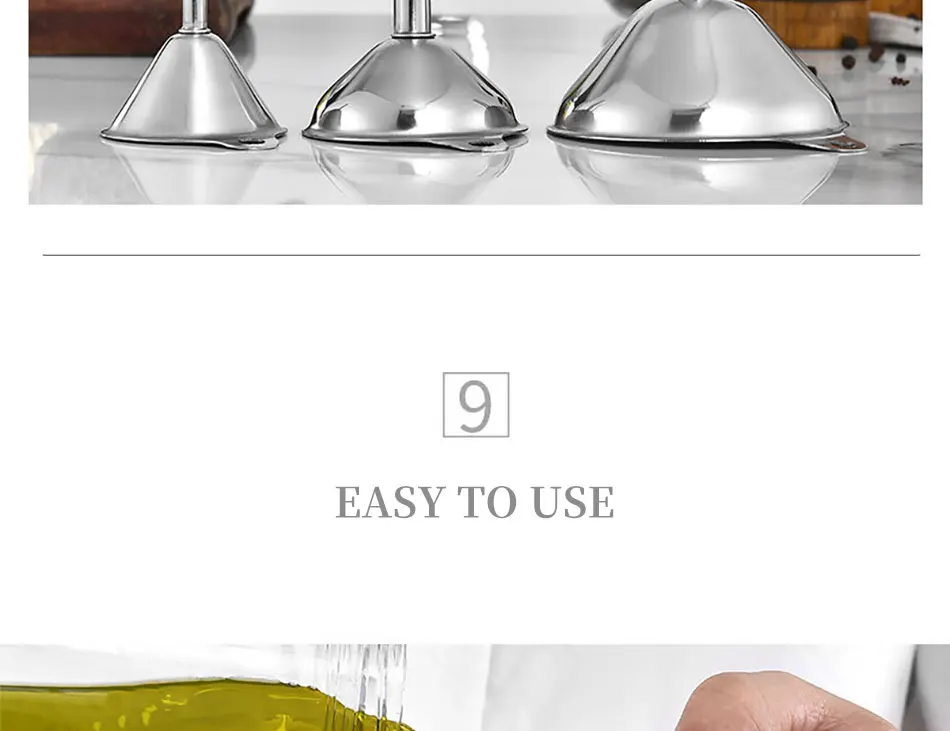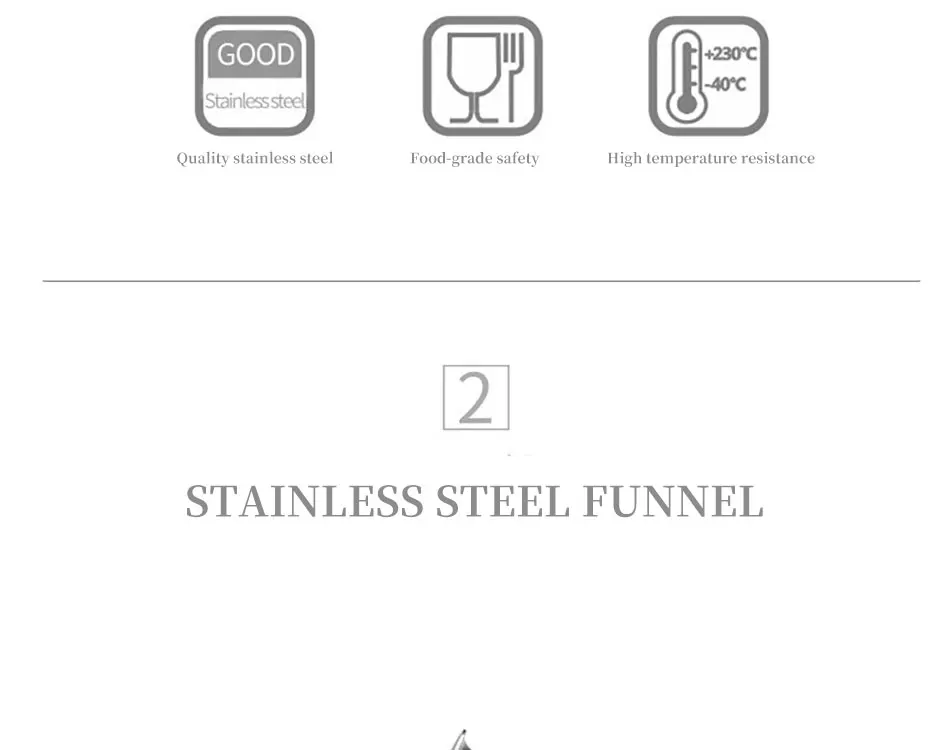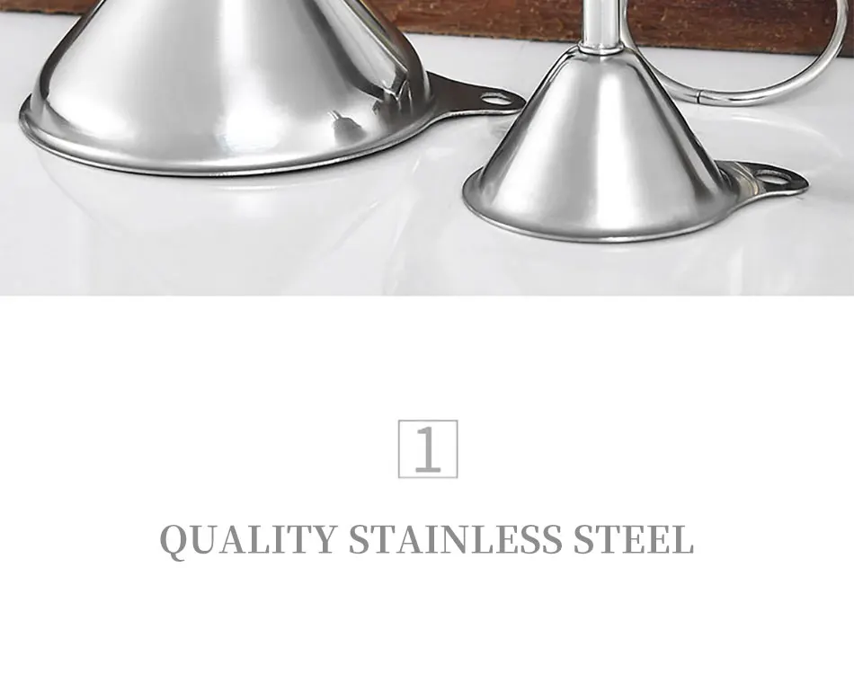 Высокая устойчивость к ржавчине, царапинам, поломкам или изгибам. Каждая Воронка имеет идеально узкий стержень, позволяет жидкости протекать через трубку быстро и легко, помогает избежать беспорядка и разливов при наполнении масел, джемов, спиртных напитков и т. д.