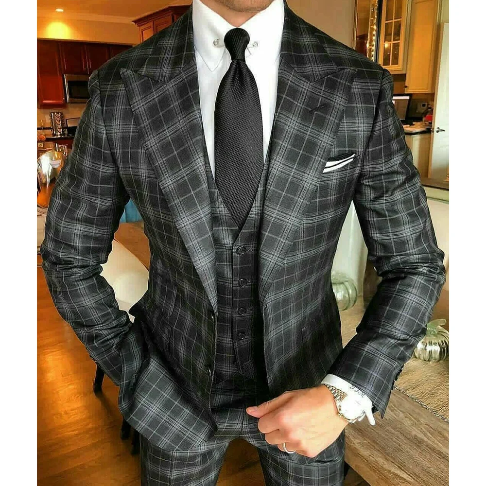 2021 черный Slim Fit Комплект из 3 предметов в клетку мужские свадебные костюмы в клетку для выпускного вечера вечерние лацкан с тупым углом смокинги из твида Полушерстяное пальто + жилет + штаны