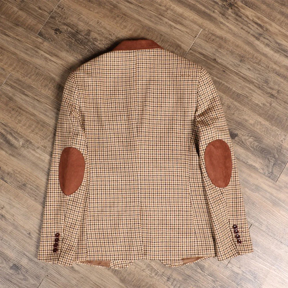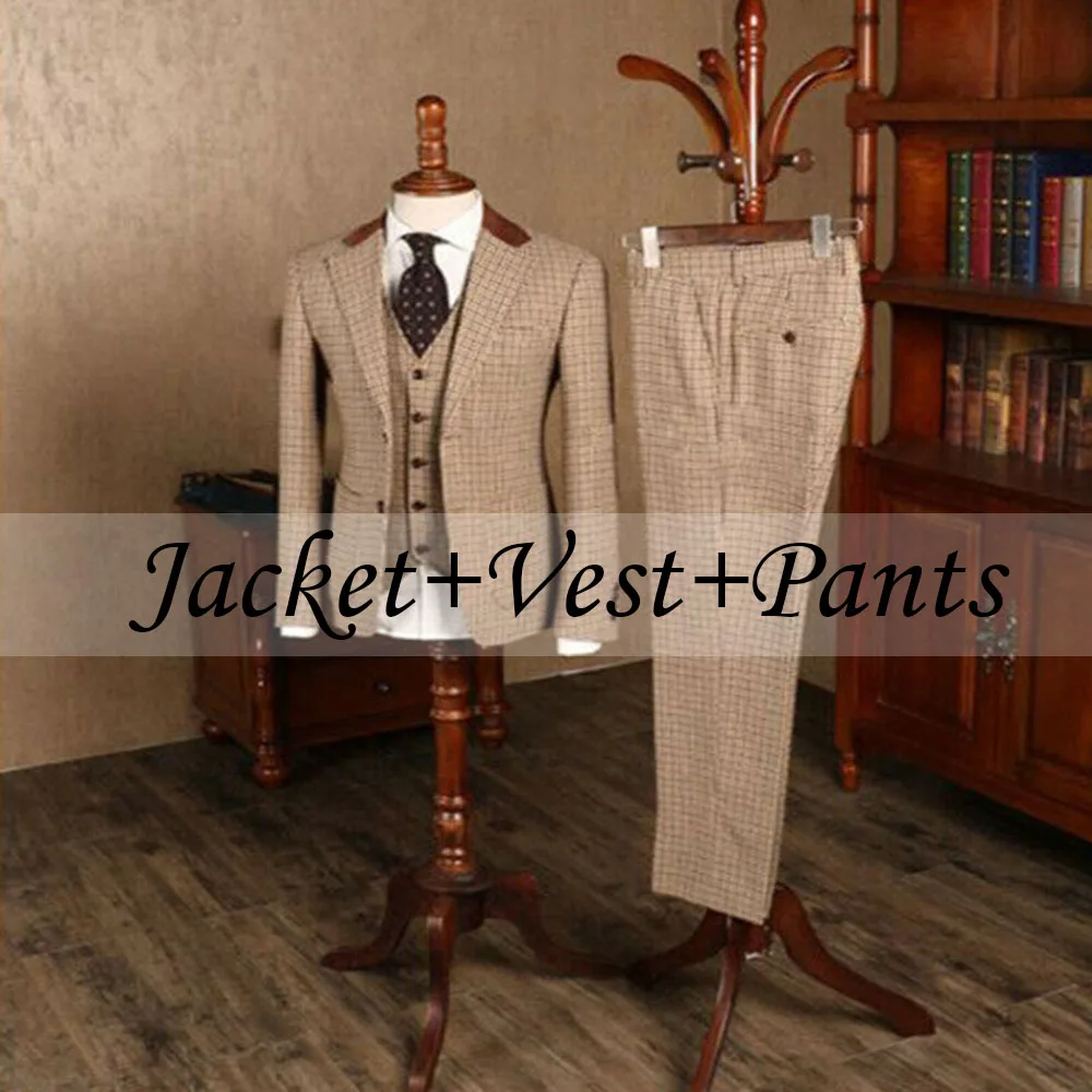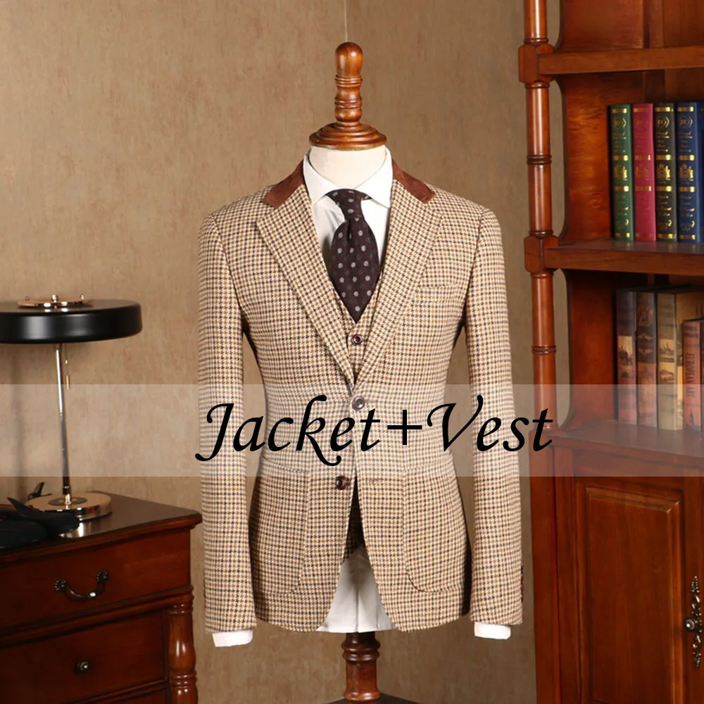 Мужской приталенный костюм из твида, черный двубортный блейзер с пиковым отворотом, винтажный клетчатый плотный шерстяной пиджак с брюками, 2021