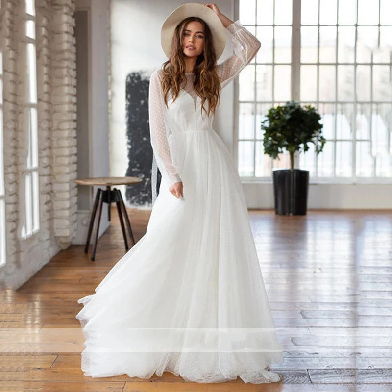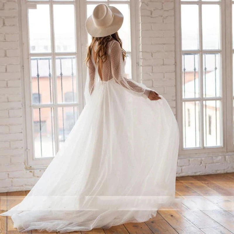 Платье Свадебное FDHAOLU FU250 в стиле бохо, Пляжное Тюлевое ТРАПЕЦИЕВИДНОЕ, с пышными рукавами, в горошек, свадебное платье принцессы на заказ